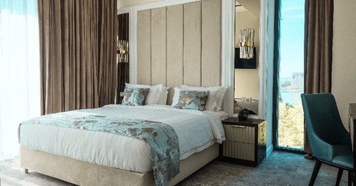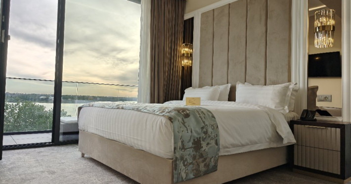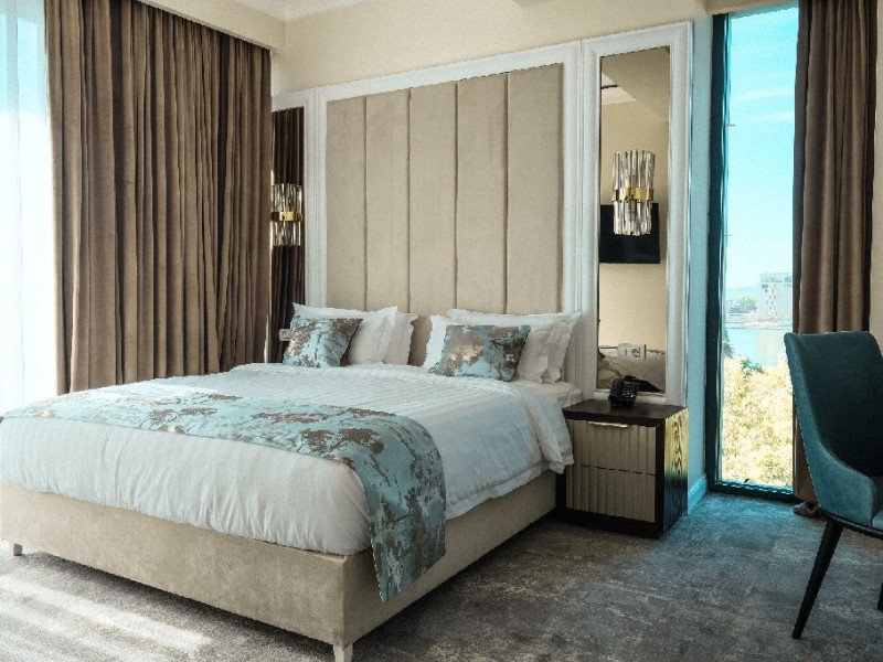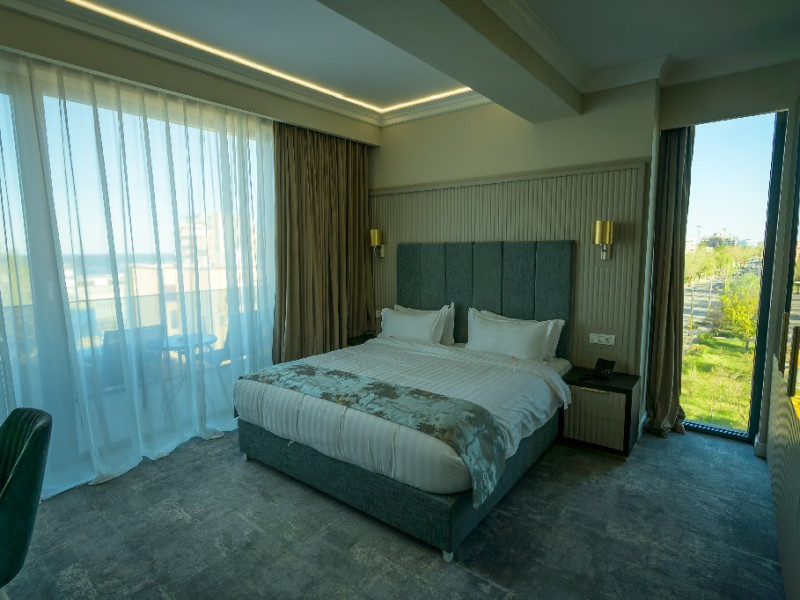 DESCRIERE CAMERE Dotari camere: Baia proprie include cabina de dus, articole de toaleta, uscator de par, papuci, prosoape si halat. Fiecare camera este dotata cu televizor smart, acces la canale prin cablu si Wi-Fi gratuit, aer conditionat, camerele dispun de balcon privat cu vedere spre lac sau spre statiunea Mamaia, aparat de cafea si ceai, fier si masa de calcat, seif, minibar, telefon fix.