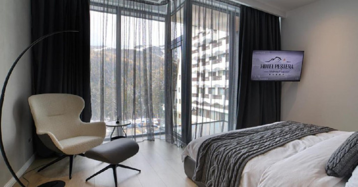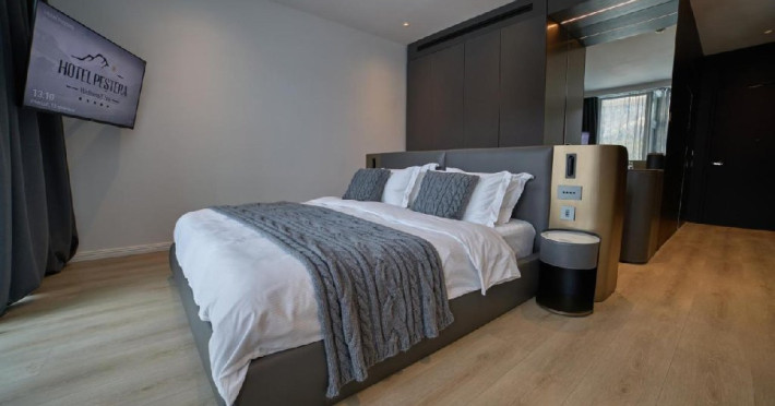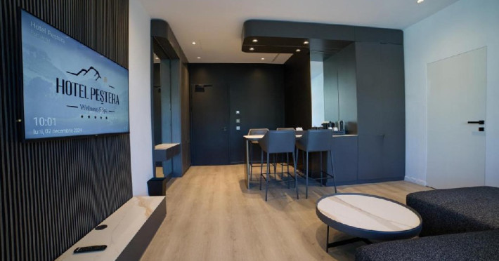INFORMATII GENERALE Hotel Pestera este situat in Parcul Natural Bucegi la 1610 metri altitudine. DESCRIERE UNITATE DE CAZARE Hotelul dispune de parcare, restaurant cu terasa, bar, foisor, patinoar si centru SPA, statii de incarcare pentru autovehicule electrice. FACILITATI UNITATE Centrul SPA include urmatoarele facilitati: Piscina interioara pentru copii - un spatiu sigur si distractiv, cu temperatura controlata si adancime adecvata celor mici. Piscina interioara, situata intr-un cadru elegant, cu design modern, este un loc ideal pentru relaxare indiferent de sezon. Piscina exterioara incalzita, perfecta pentru toate anotimpurile. O varietate de saune de lux, fiecare cu beneficii specifice pentru sanatate si relaxare: sauna finlandeza, cu sare de Himalaya, hammam, biosauna.