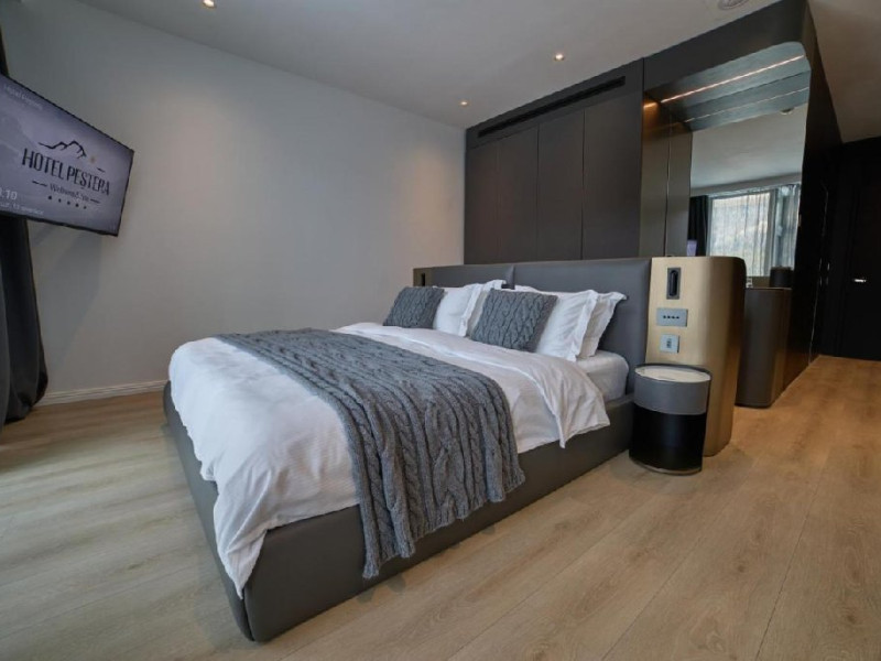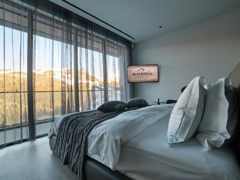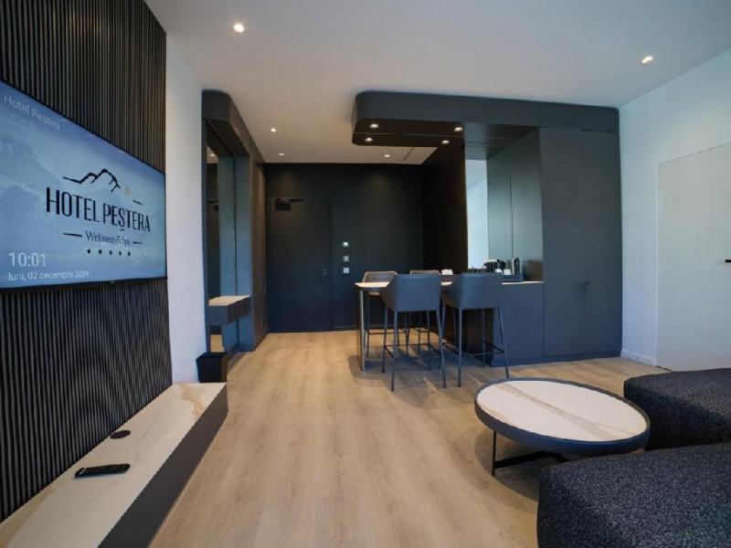 Alee Kneipp, un tratament hidroterapeutic unic ce stimuleaza circulatia sangelui prin alternarea apei calde si reci, oferind un masaj natural pentru talpi. DESCRIERE CAMERE Noul corp de 5* ofera camere spatioase si elegante cu dotari moderne. Camerele duble 5* ofera un pat matrimonial. Apartamentele Sunrise 5*, Sunset 5* si cu vedere panoramica 5* includ un dormitor cu pat matrimonial si living cu o canapea neextensibila. Camerele Duble au o suprafata de 18 mp si dispun de doua paturi twin care se pot apropia sau de un pat matrimonial. Camerele Duble Executive dispun de o suprafata de 26 mp in care se afla un pat matrimonial si o canapea extensibila. Suitele si Suitele Executive ofera un spatiu de 40 mp cu un pat matrimonial si o canapea extensibila. Presidential Suite ofera confort intr-un spatiu de 61 mp, are un pat matrimonial si o canapea extensibila. Dormitorul secundar are un pat king-size cu latimea de 180 cm. O parte din camere au vedere spre munte, iar celelalte au vedere spre padure. Camerele cu vedere spre padure includ si vedere catre constructia in lucru a noului hotel Pestera 5*. Printre dotarile camerelor se numara: aparat Nespresso ceai, balcon, fierbator de apa/cafea/ceai, minibar (contra cost), oglinda, seif, telefon, TV LED, uscator de par, Wi-Fi. LOCALIZARE Accesul auto este din drumul national DN 71 Sinaia-Targoviste spre Cabana Cuibul Dorului, Cabana Dichiu, Pestera prin DJ 713 (TransBucegi - Drum asfaltat) sau pe drumul DJ 714 din Moroeni spre Sanatoriu, Zanoaga, Padina, Pestera. ATRACTII TURISTICE Pestera Ialomitei, Manastirea Pestera Ialomitei, Parcul Natural Bucegi, Lacul Bolboci, Varful Omu, Cheile Tatarului, Babele, Sfinxul, Piatra Arsa, Spintecatura Ursilor. POLITICI Nu se accepta animale de companie. SERVICII DE MASA Mesele se servesc in restaurantul propriu, Restaurant 1610, cu o capacitate de 120 locuri. Turistii se pot relaxa si pot socializa pe Terasa la Soare sau in Cafe-Bar. FACILITATI COPII Hotelul are amenajat un patinoar. FACILITATI EVENIMENTE Cabana Veche este partea ramasa din vechea Cabana Pestera, construita in anul 1940. In prezent, aici se afla un salon multifunctional, ideal pentru conferinte sau petreceri private.