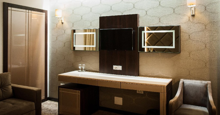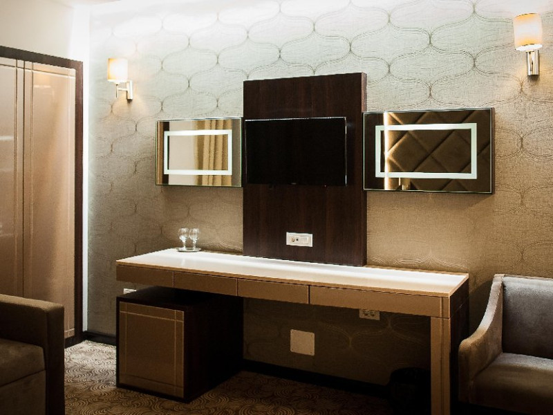 DESCRIERE CAMERE: Camerele duble au pat matrimonial sau twin, mocheta, aer conditionat, balcon cu masuta si scaun, tv smart, telefon, fierbator de apa, birou de lucru cu internet Wi-Fi sau cablu gratuit, minibar cu produse, baia este dotata cu cabina de dus, uscator de par si cosmetice de baie. Halate de baie, papuci de camera, seif, perie de incaltaminte se gasesc in sifonier. Unele camere au fotoliu extensibil pe post de pat suplimentar. Apartamentele sunt formate din dormitor si living despartite de usa, baie si balcon. Dormitorul are pat matrimonial, mocheta, tv, birou de lucru, livingul dispune de canapea extensibila, minibar, seif, tv, aer conditionat, fierbator de apa, masuta de cafea. Baia este cu cabina de dus, halate de baie si papuci de camera, cosmetice de baie, uscator de par.