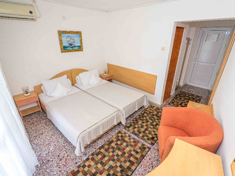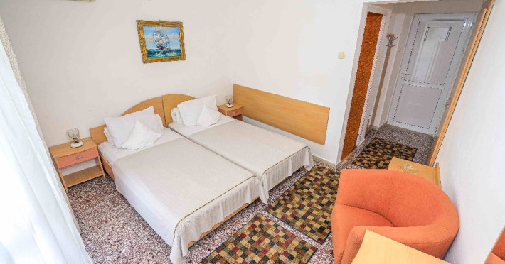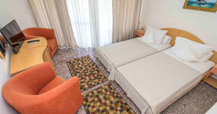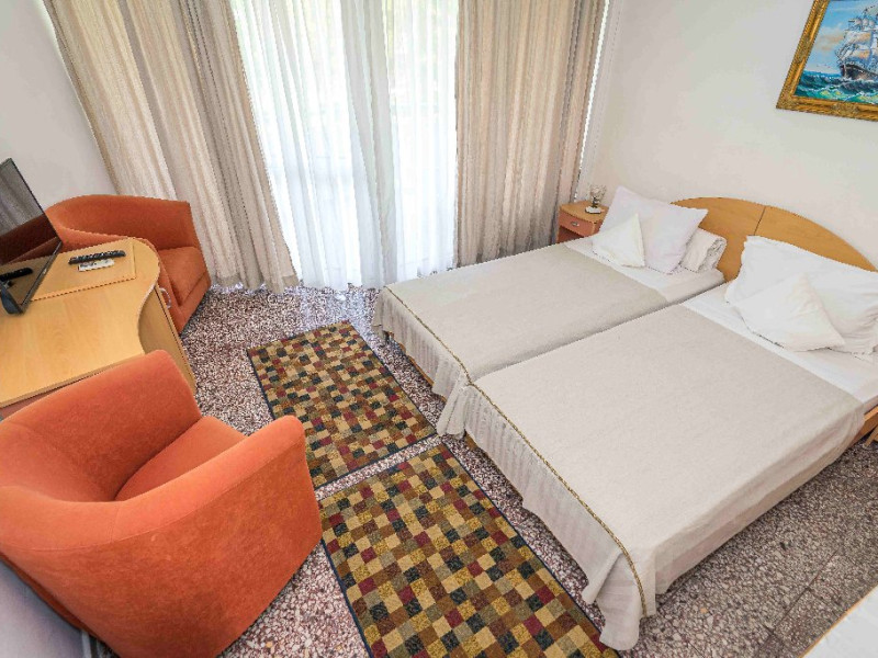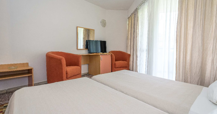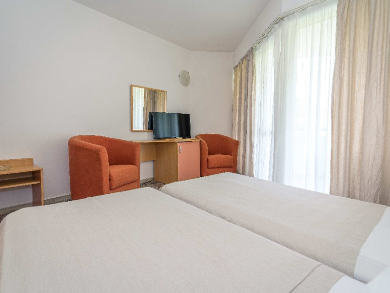 DESCRIERE CAMERE Cele 130 de camere de circa 15mp sunt dotate cu doua paturi twin confortabile, aer conditionat, minibar, TV LCD, Wi-Fi, baie proprie cu dus si balcon cu mobilier de terasa, cu vedere catre statiunea Venus. Oaspetii hotelului se bucura de linistite si mai multa intimitate datorita designului aparte pe litoralul romanesc.Recomandare: Camera Dubla twin poate gazdui 2 adulti.