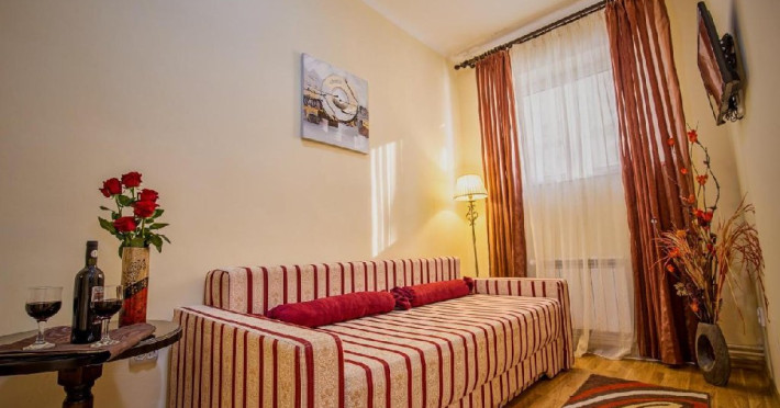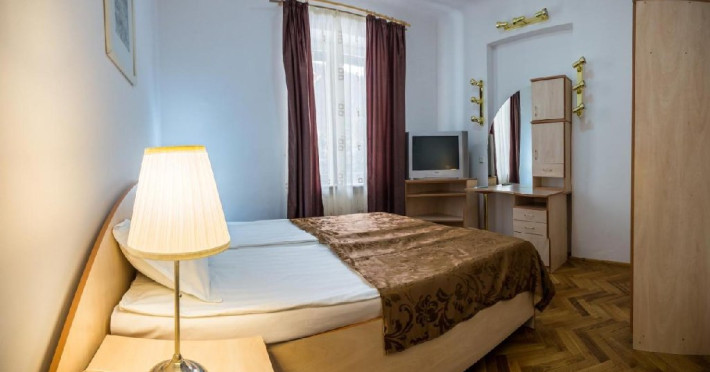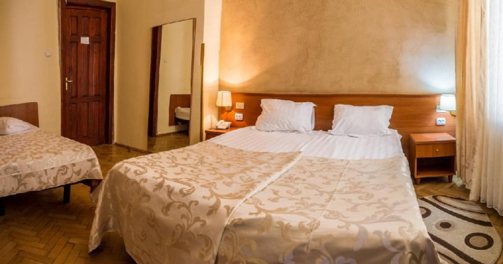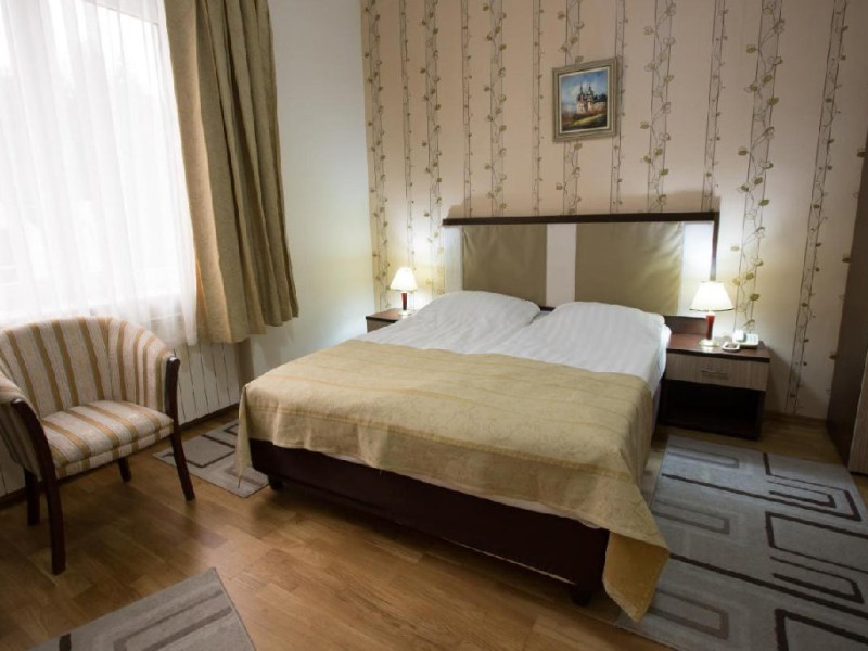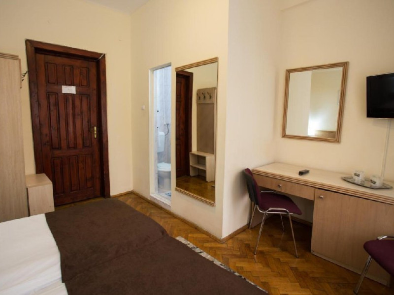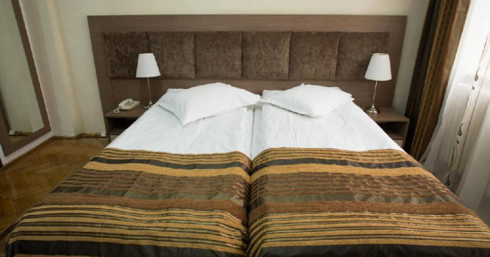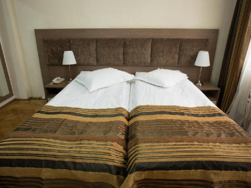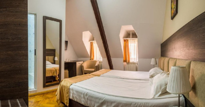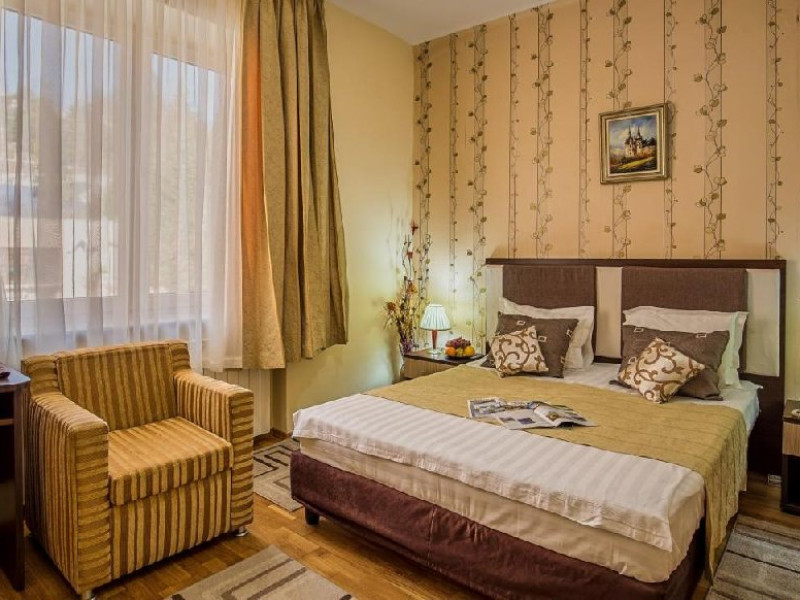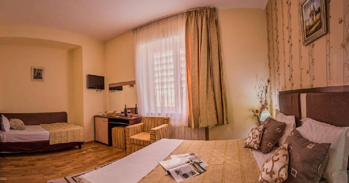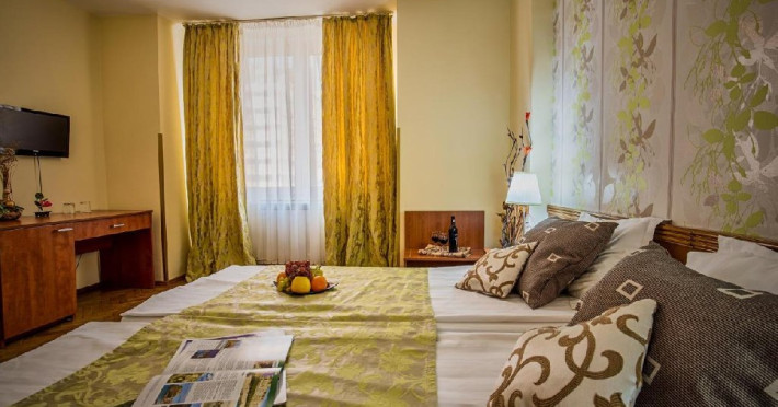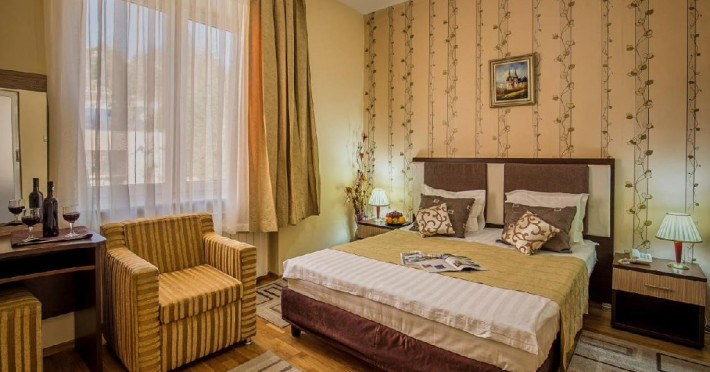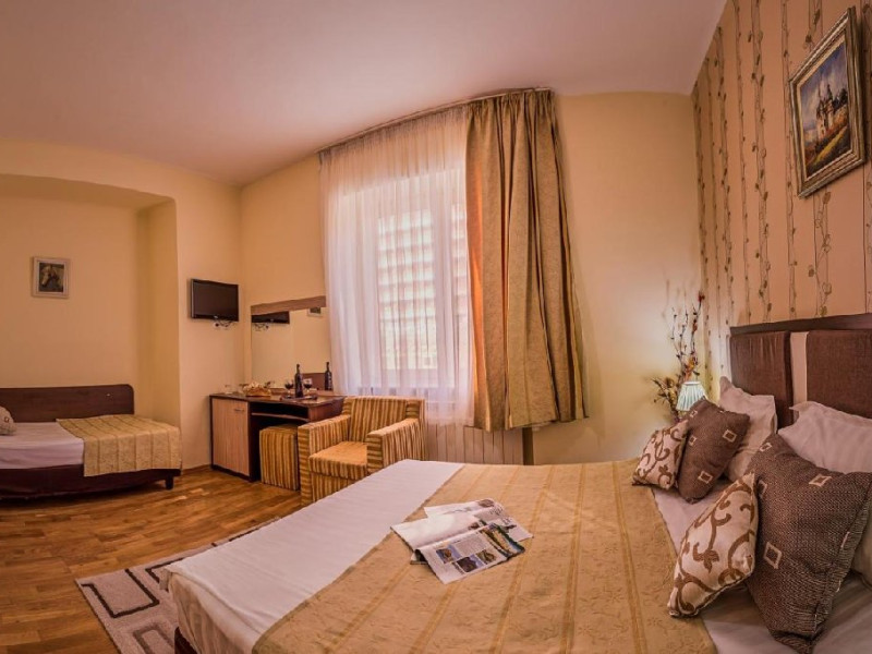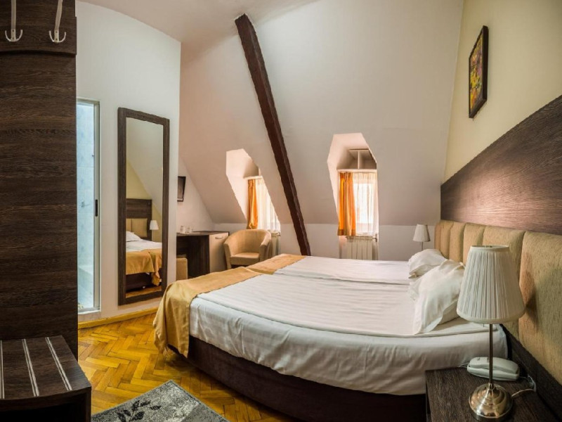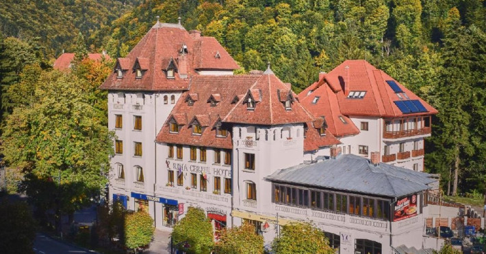 INFORMATII GENERALE Hotelul Rina Cerbul este situat in centrul orasului Sinaia, la 500 de metri de gara si de telegondola. DESCRIERE UNITATE DE CAZARE Confortul si designul modern, impreuna cu cea mai buna valoare pentru bani, fac din Hotelul Rina Cerbul alegerea potrivita pentru un sejur la munte in Sinaia. FACILITATI UNITATE Hotelul pune la dispozitia turistilor parcare (contra cost), internet Wi-Fi. DESCRIERE CAMERE Camera dubla are un decor classic si include un pat dublu sau doua paturi twin. Camera tripla dispune de un pat dublu si un pat single. Apartamentul este compus dintr-un dormitor cu pat dublu si un living separat, dotat cu o canapea extensibila. Toate camerele dispun de TV, telefon, internet Wi-fi si baie proprie. LOCALIZARE Hotelul Rina Cerbul este situat in centrul orasului Sinaia, la 500 de metri de gara si de telegondola. ATRACTII TURISTICE Muzeul Peles, Pelisor, Manastirea Sinaia, Muzeul Bucegi, Cazinoul Sinaia, Casa Memoriala George Enescu. POLITICI Nu se accepta animale de companie. SERVICII DE MASA Nu se asigura servicii de masa. FACILITATI COPII In camera dubla se poate adauga maxim un pat suplimentar pentru copiii cu varste de pana la 12 ani.