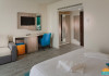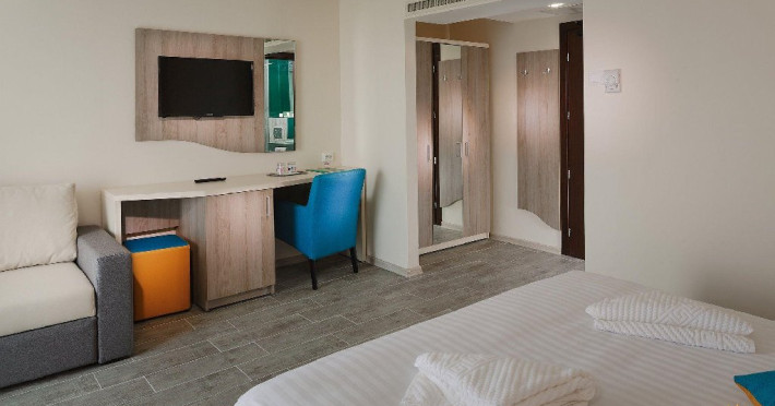 Camera Studio Deluxe fara balcon - este o camera dubla cu o suprafata mai generoasa, ce are in componenta un pat dublu matrimonial, o canapea extensibila si chicineta, vedere laterala la mare.Localizata la etajul 14 al hotelului nu detine balcon.