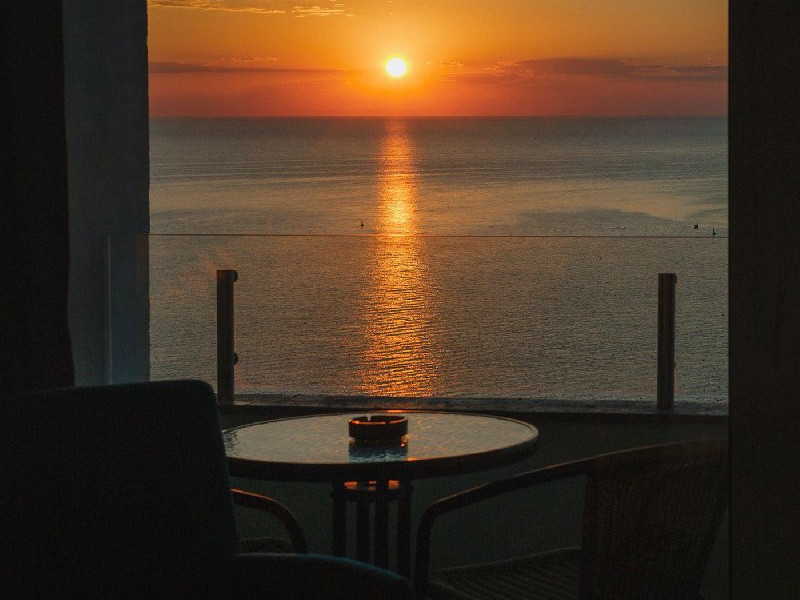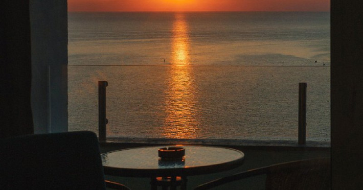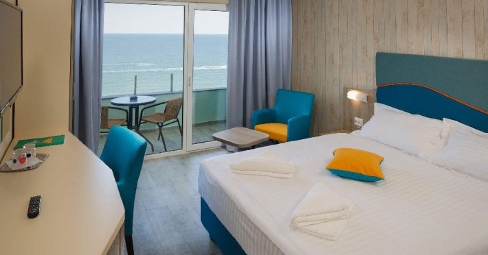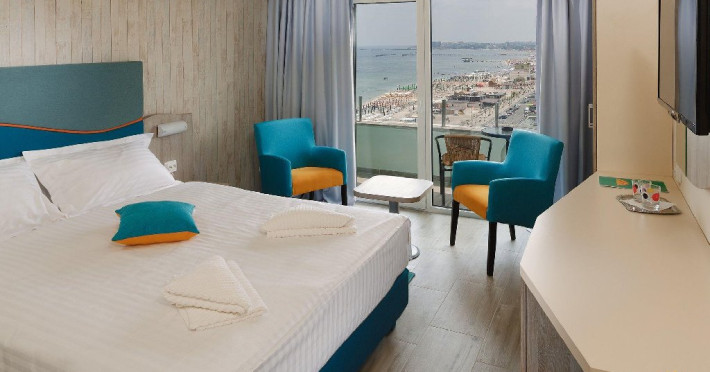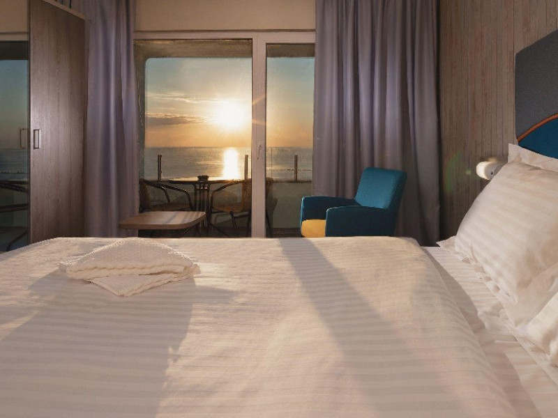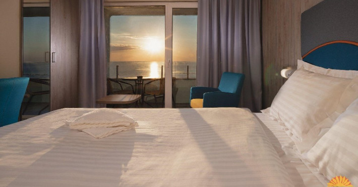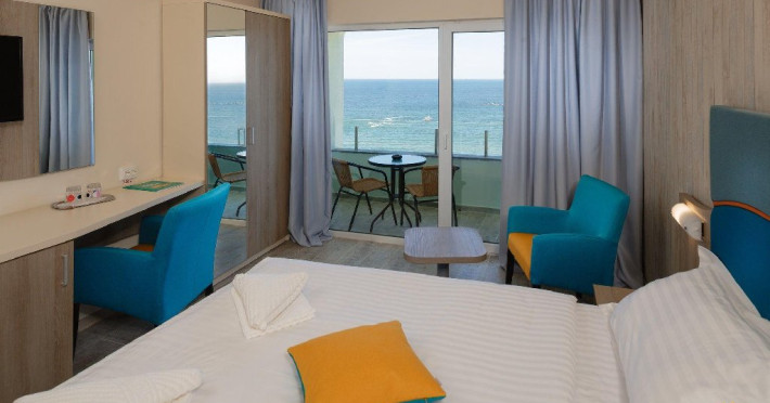 Camera Seaview cu balcon - are vedere directa la mare, pat dublu matrimonial si balcon dotat cu masuta si scaune de terasa.