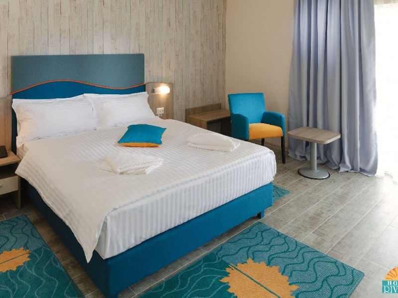 Camera Standard cu balcon - are vedere laterala la mare, pat dublu matrimonial si balcon dotat cu masuta si scaune de terasa.