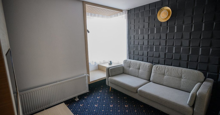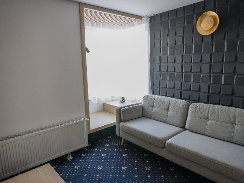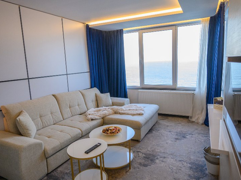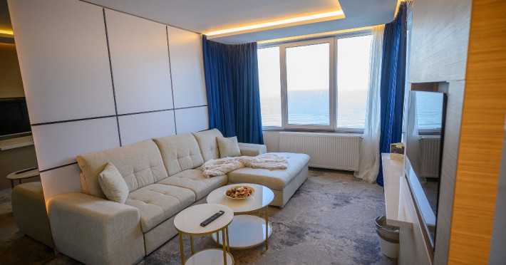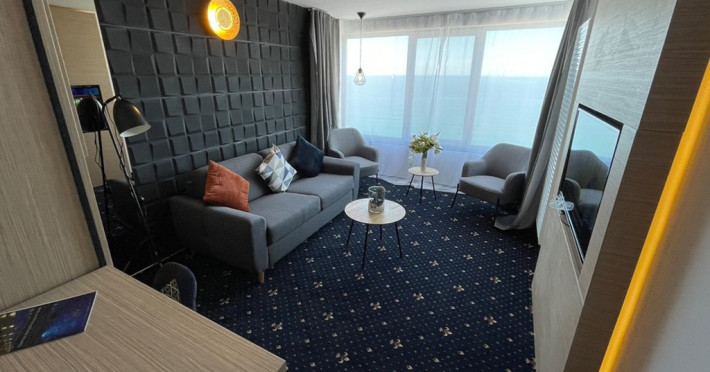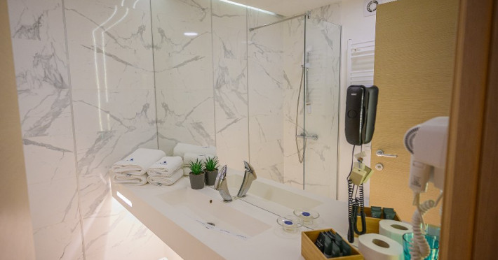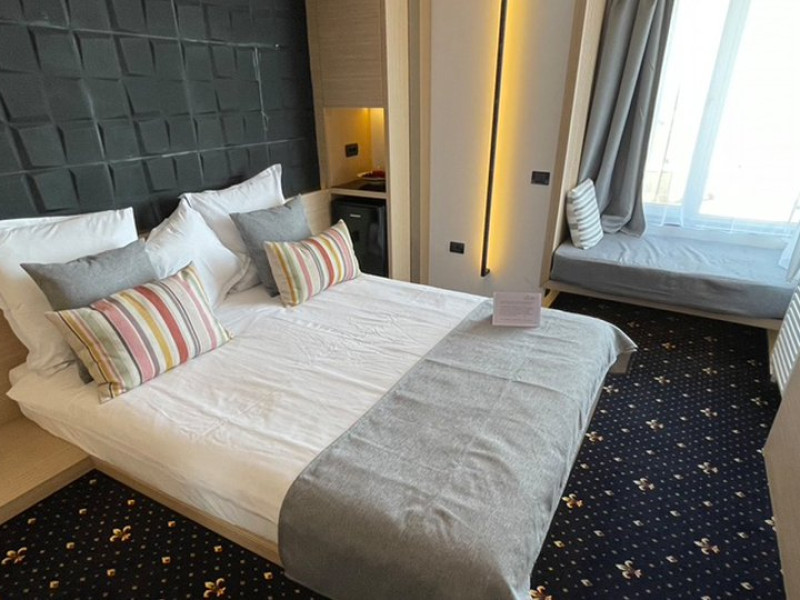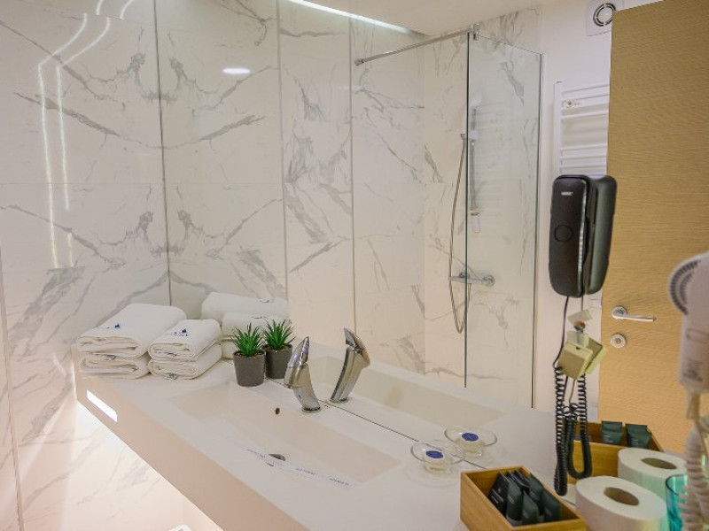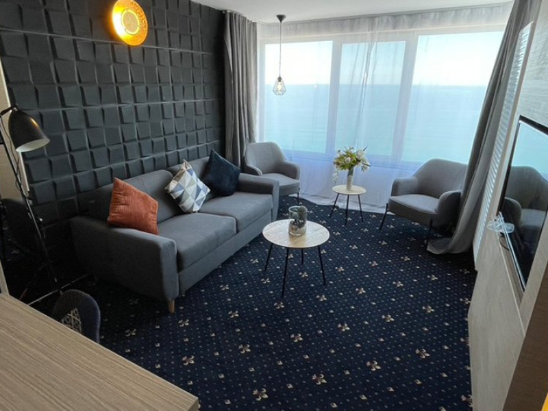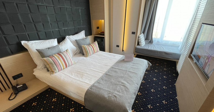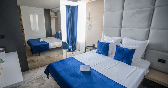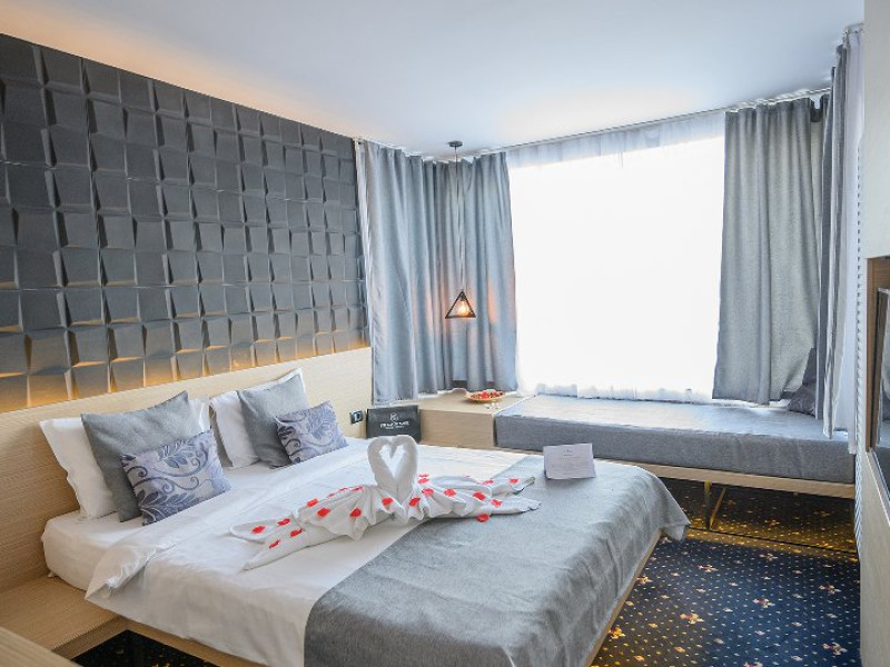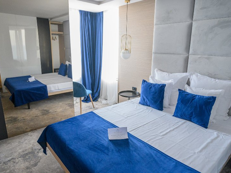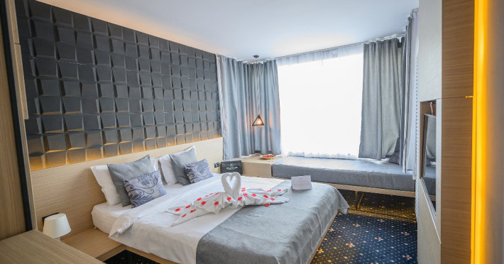 DESCRIERE CAMERE Dotari camere: aer conditionat, mocheta, TV -LCD, minibar -sau racitor vinuri, seif, baie cu cabina de dus, internet -wireless, uscator de par. DUBLE STANDARD, DUBLE STANDARD- VEDERE PARTIALA LA MARE, DUBLE SUPERIOR - capacitate maxima 2 adulti si 2 copii 0- 11 ani ce pot fi acomodati in patul generos sau pe o sofa de 1.40 m situata in dreptul ferestrei. Suprafata totala a camerei este de 18 mp si dispune de un pat matrimonial de 160 x 200 cm, o sofa de 60 x 140 cm , un generos LCD TV de 42, minibar modern, cabina de dus, uscator de par, fier de calcat, seif si WiFi. Nu permit pat suplimentar, dispun de sofa. Camerele duble Superioare sunt cele mai noi camere din hotel si sunt pozitionate la etajele superioare ale hotelului. APARTAMENTE- au vedere partiala la Portul Agigea si Marea Neagra, fiind amplasate pe latura nordica a hotelului. Apartamentele sunt compuse din living si dormitor, un hol si un grup sanitar. Dormitorul este dotat cu un pat dublu de 160200 + o sofa de 140 x 60 cm + LCD TV de 40. Livingul este dotat cu o canapea extensibila de 18070 cm (180140 cm cand este deschisa), un LCD TV de 40. Suprafata totala a apartamentului este de 35 mp iar biroul, minibarul, cele 2 dulapuri duble, aerul conditionat sunt disponbile in holul apartamentului de unde se face si accesul catre baia dotata cu o cada de 120 cm, articole de toaleta, uscator de par, prosoape, halate si papuci. Capacitate maxima: 3 adulti si 1 copil 0- 14 ani sau 2 adulti si 2 copii 0- 14 ani. SMALL TRIPLE ROOM: stuate la etajele 6-11 ale hotelului - capacitate maxima 3 adulti si maxim 1 copil 0- 6 ani, ce poti fi acomodati in patul dublu si pe patul single. Suprafata totala a camerei este de 18 mp si dispune de un pat matrimonial de 140 x 200 cm + un pat single de 80x200 cm , un generos LCD TV de 42, minibar modern, cabina de dus, uscator de par, fier de calcat, seif si WiFi.