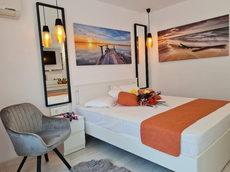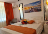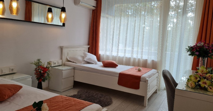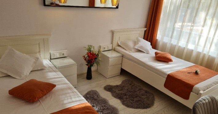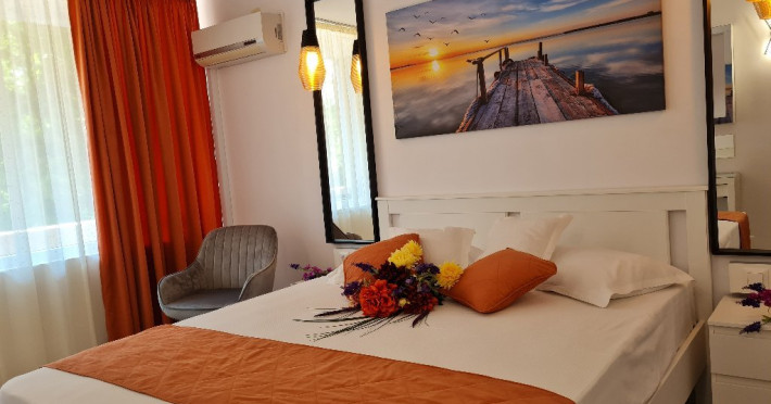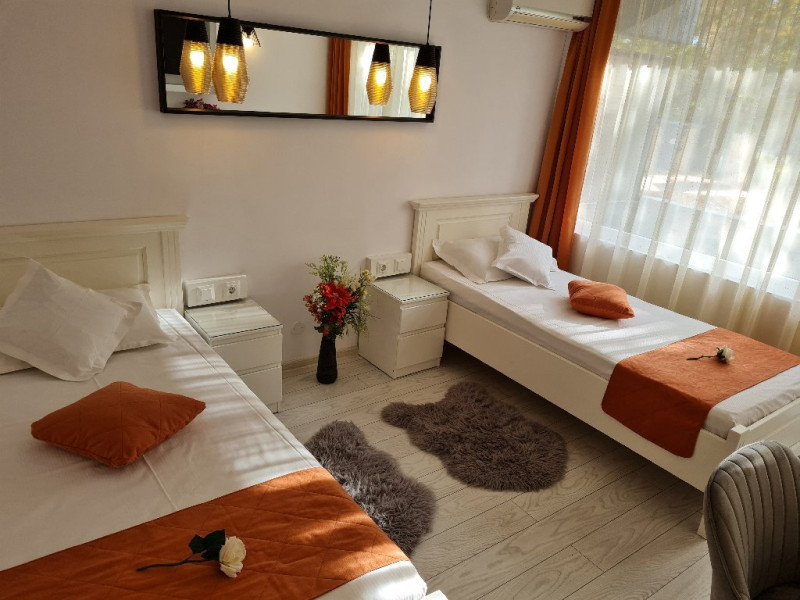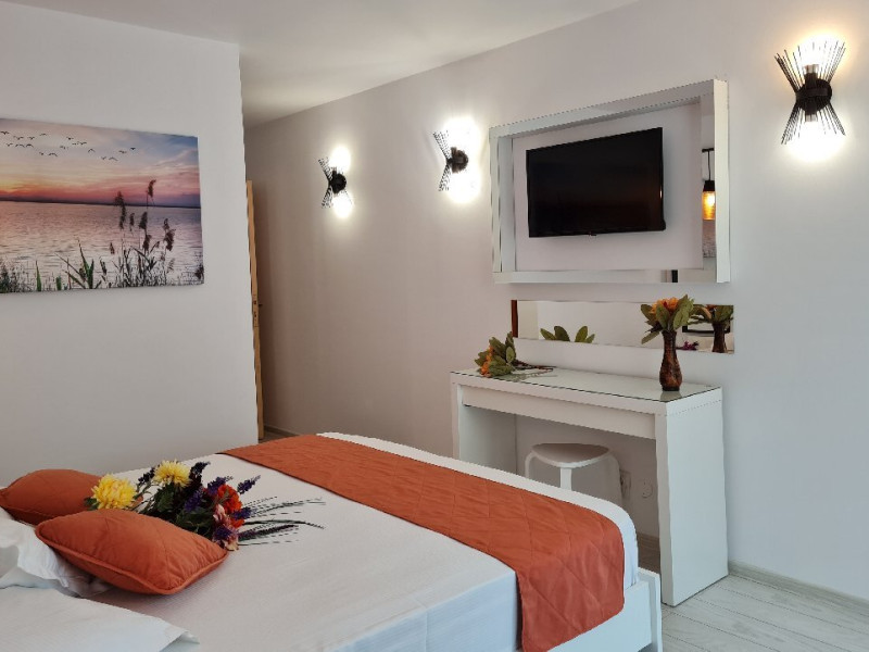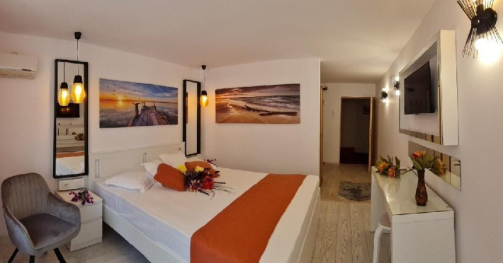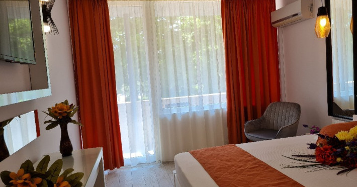 ATENTIE! Turistii vor primi de la receptie bratari de identificare pe care le vor purta obligatoriu la mana. Numai pe baza acestor bratari de acces purtate la mana, nedetasabile, netransmisibile, se va face accesul la plaja si la piscina Hotelului si vor putea folosi sezlongurile si umbrelele pentru plaja. In cazul deteriorarii bratarii, aceasta va fi inlocuita doar in schimbul celei deteriorate. Bratara va fi predata la receptie, la check-out, odata cu predarea cheii de la camera si a cardului pentru bariera, in caz contrar vor trebui sa achite contravaloarea acestora. DESCRIERE CAMERE Dotari camere: aer conditionat, TV -LCD, minibar, seif, baie cu dus, balcon -la camerele de la etaj (cu mobilier de terasa cu uscator de rufe), internet -wireless gratuit, uscator de par. Numar total camere: 127 Duble: 127 - dintre care 81 camere duble cu pat matrimonial si 46 camere duble cu doua paturi.