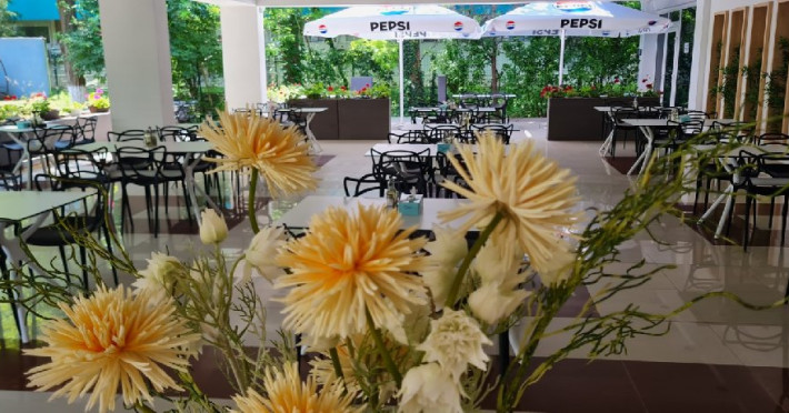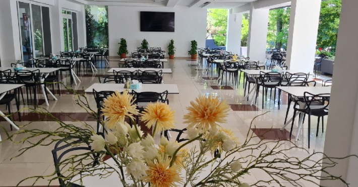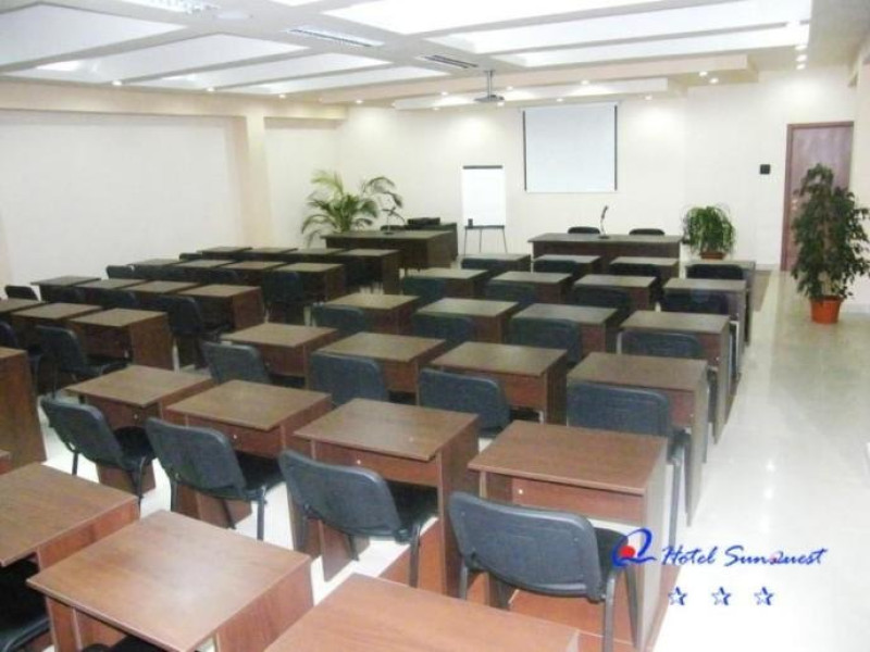 FACILITATI EVENIMENTE Sali de conferinta: 2 - cu capacitate de: 120 locuri si 90 locuri dotate cu: minidesk-uri modulare, videoproiector, ecran de proiectie, televizor, flipchart, microfon, amplificator adresare publica. Salile de conferinte pot fi dotate cu echipamente suplimentare (contra cost). La cerere se pot amenaja alte doua sali de conferinte cu o capacitate de 60 respectiv 80 locuri. Hotelul dispune si de salon de coffe break.