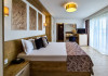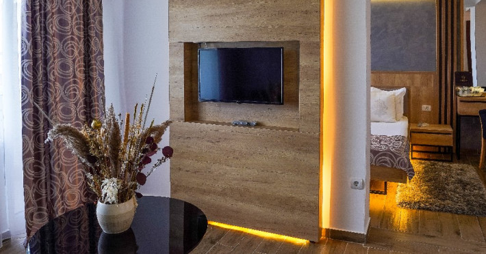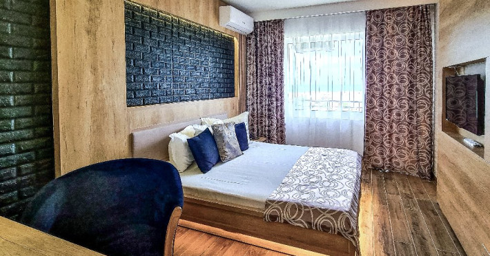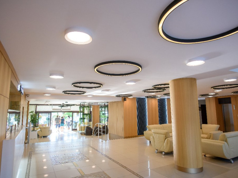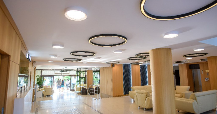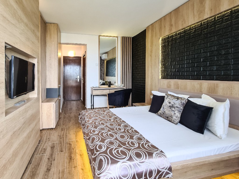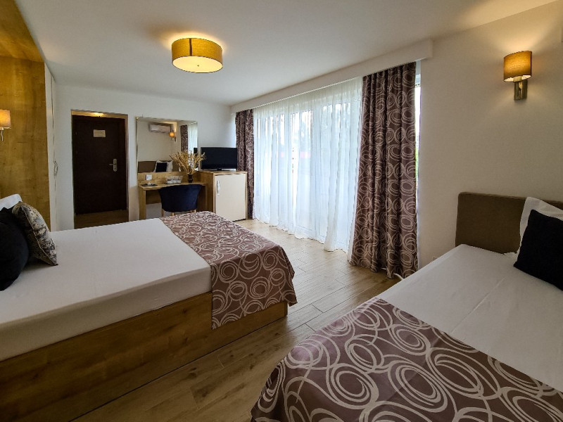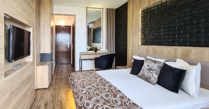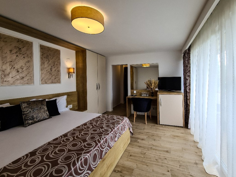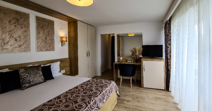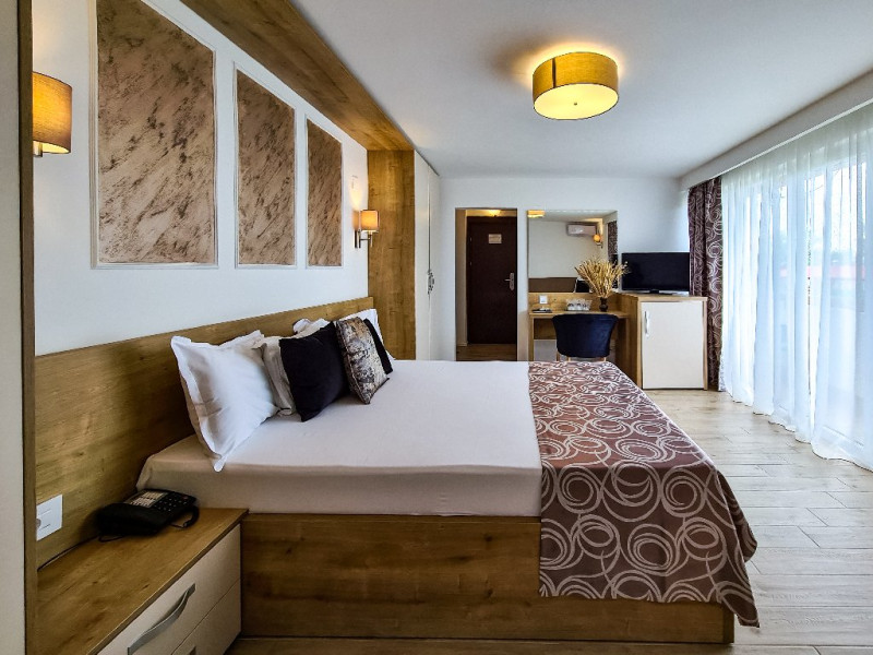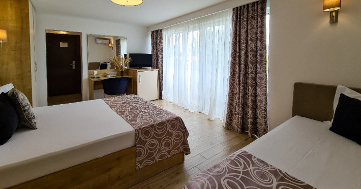 FACILITATI UNITATE Dotari generale: restaurant -(150 de locuri), parcare proprie -gratuita in limita disponibilitatilor- cca 100 locuri, loc de joaca pentru copii, internet -wireless gratuit , pastrare obiecte de valoare, terasa - 200 locuri cu vedere la mare, receptie, camera de bagaje, 2 lifturi, hotel complet renovat, parter + 4 etaje. DESCRIERE CAMERE Numar total camere: 188 Duble: 173 - dintre care 157 camere cu pat matrimonial si 16 camere cu doua paturi. Patul suplimentar, este de tip pull-out, incorporat in patul matrimonial, iar dimensiunea este de 80/170 cm. Apartamente: 2 - apartamentul este compus din living si dormitor. Triple: 13 - un pat matrimonial si 1 pat pentru 1 persoana. Au suprafata mai mare decat camerele duble. Suita Deluxe: formata din living si dormitor open space; canapea extensbilila in living si pat matrimonial in dormitor. Dotari camere:aer conditionat, TV - LCD, minibar, baie cu cada -in apartamente si camerele triple, baie cu dus -in camerele duble, balcon -cu gresie, masuta si doua scaune, internet -wireless gratuit, pardoseala in camera din gresie, halate de baie si papuci, uscator de par, plasa insecte la usa de la balcon, telefon.