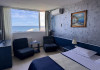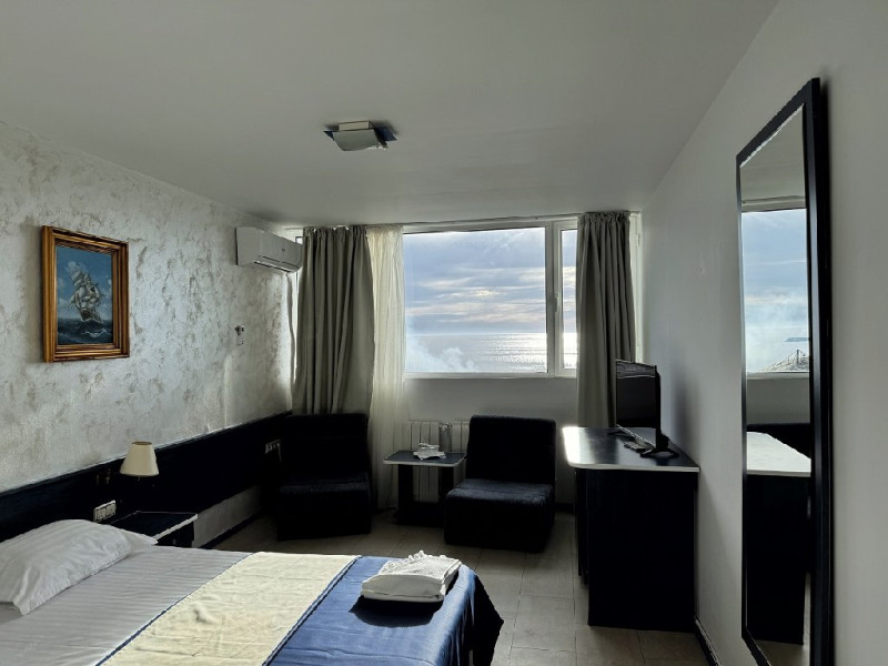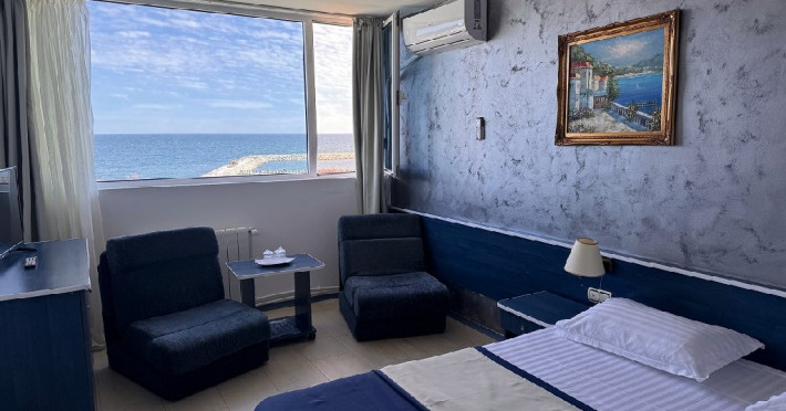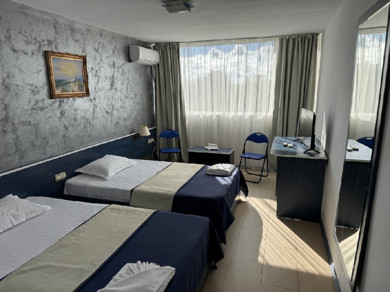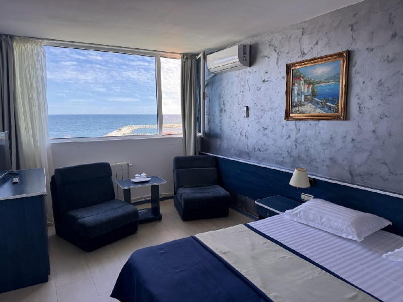 Dotari camere Camerele sunt spatioase (30 mp) si dotate cu aer conditional, televizor LCD, internet, minibar, baie cu dus, uscator de par, cafetiera, uscator de rufe. Camerele nu au balcon.Camerele pot avea vedere la mare sau vedere la statiune.