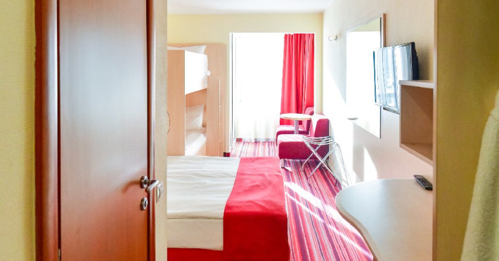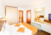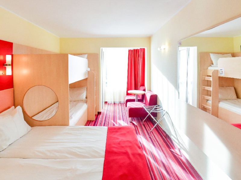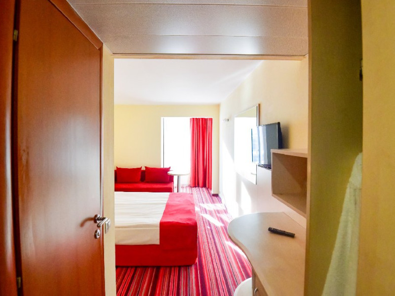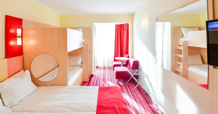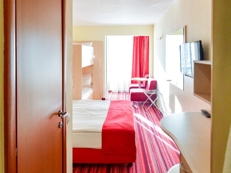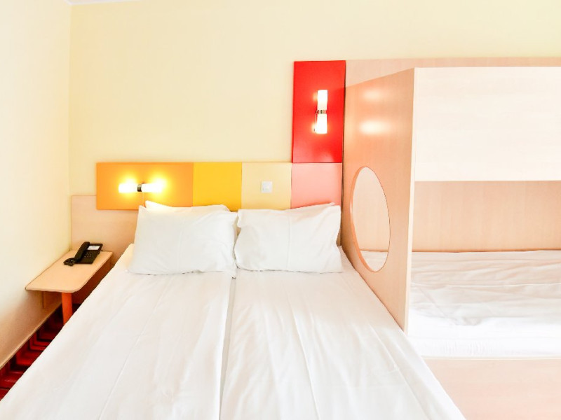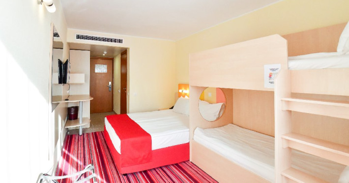 Dubla family 4* corp Jupiter Dotari: pat matrimonial (160/200 cm) si 2 paturi suprapuse de o persoana 90/190, TV, AC, frigider minibar, grup sanitar, cabina de dus, articole pentru toaleta, Wi-Fi, uscator de par, papuci, suport bagaje. Capacitate: Dubla family este potrivita sa acomodeze o familie cu 2 copii.