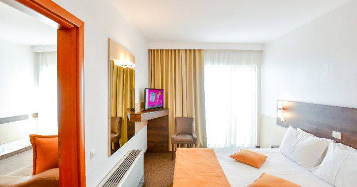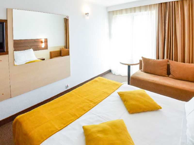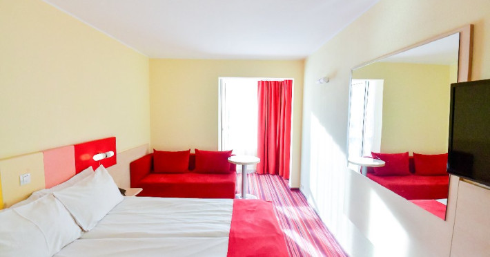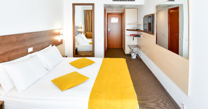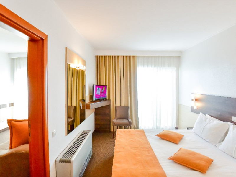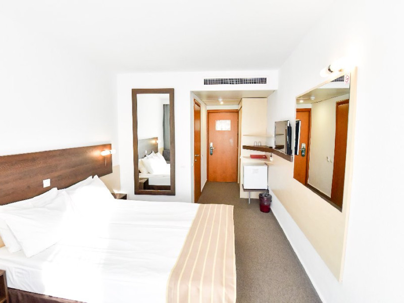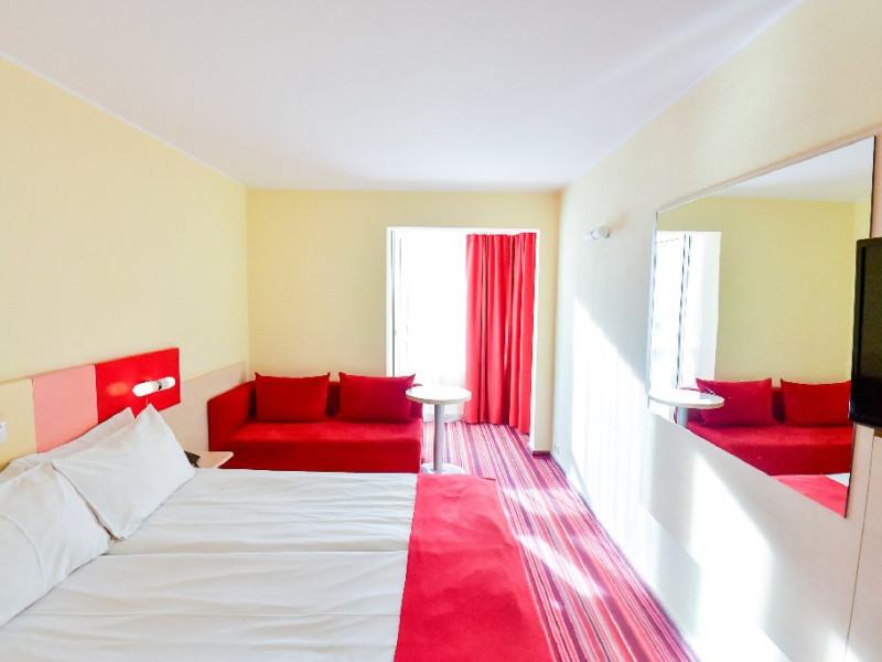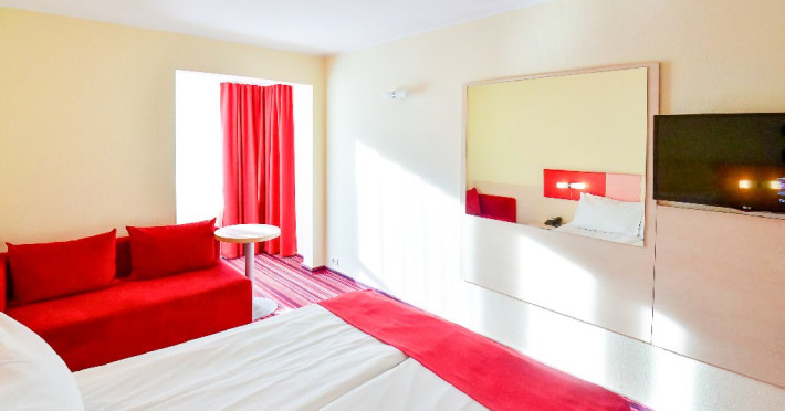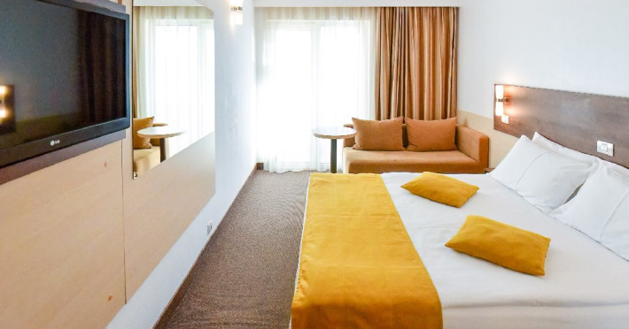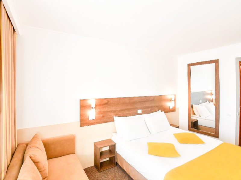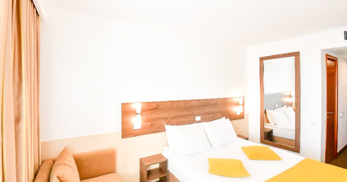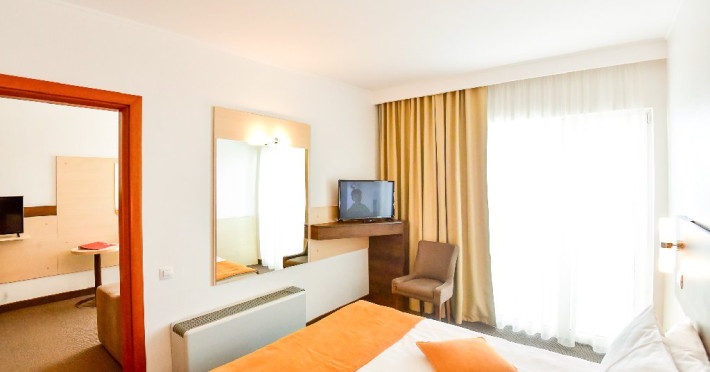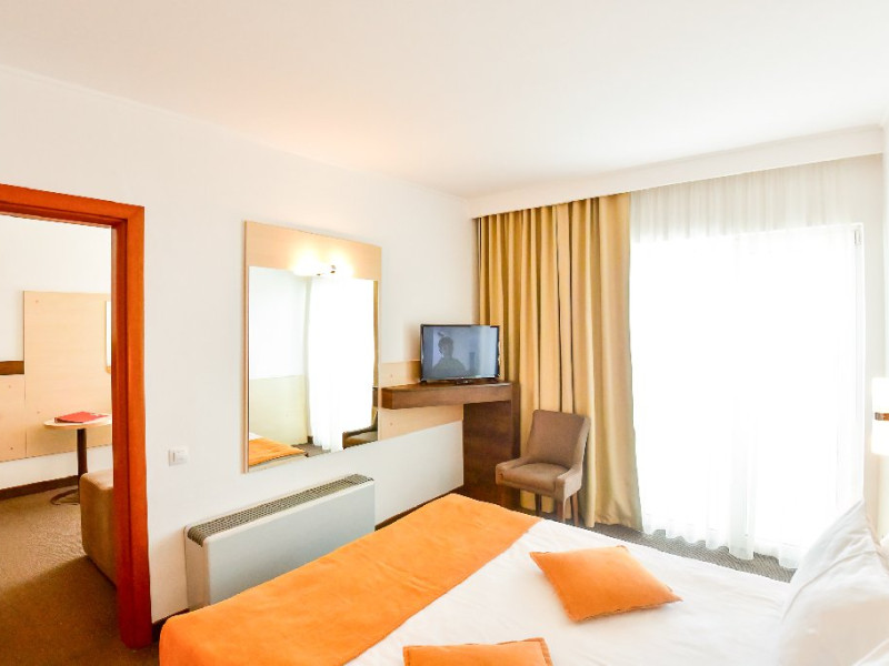 Dubla junior 4* si dubla superioara 4* corp Jupiter si Junona Dotari: pat matrimonial (160/200 cm) si 1 canapea fixa 70/150 cm, TV, AC, frigider minibar, grup sanitar, cabina de dus, articole pentru toaleta, Wi-Fi, uscator de par, papuci, suport bagaje. Capacitate: Dubla Junior este potrivita sa acomodeze un cuplu sau o familie cu 2 copii.