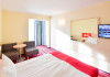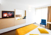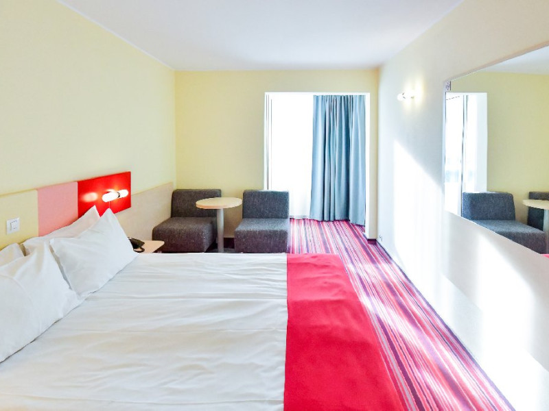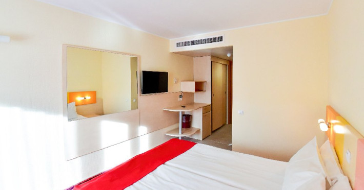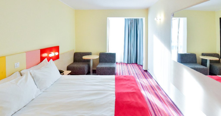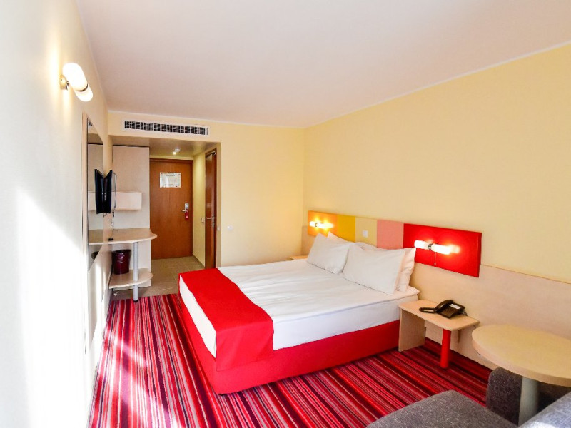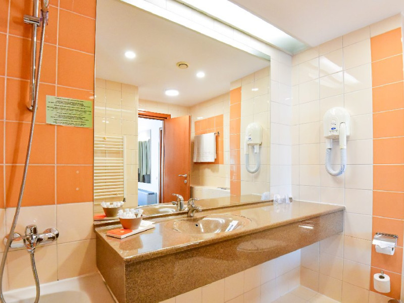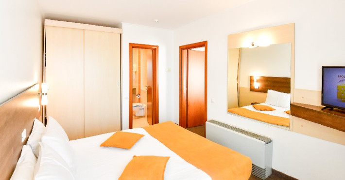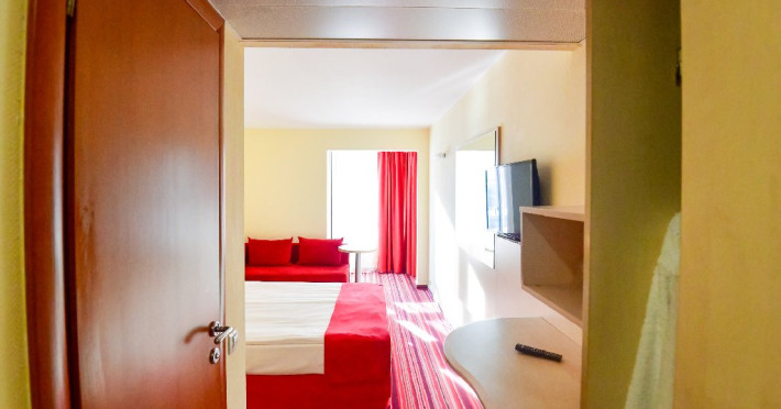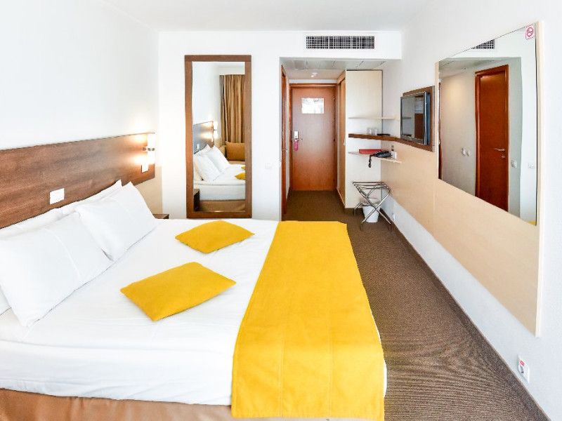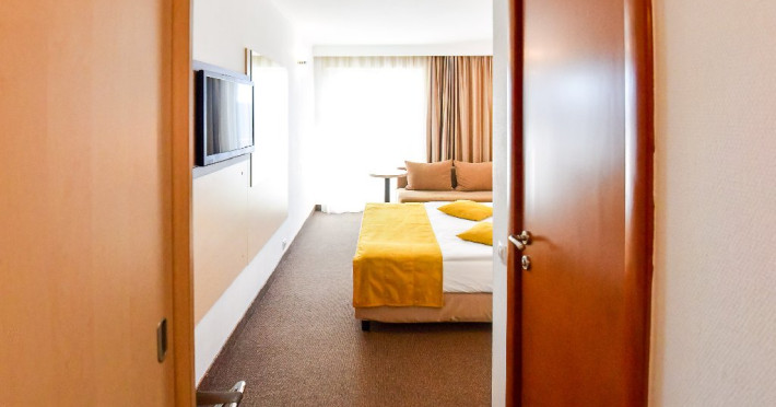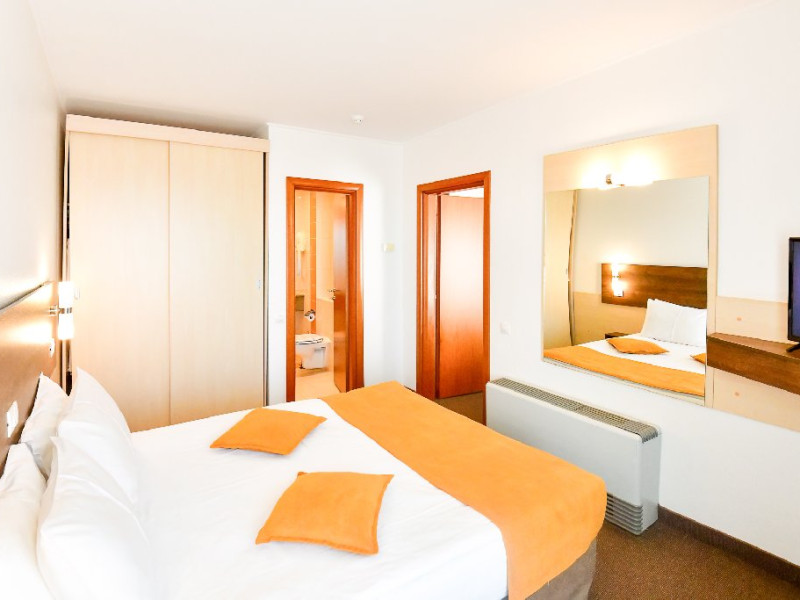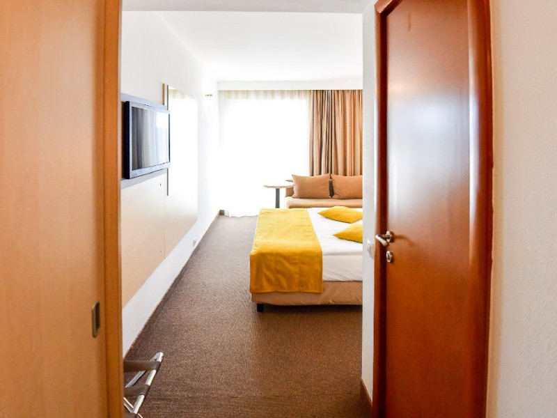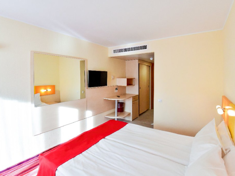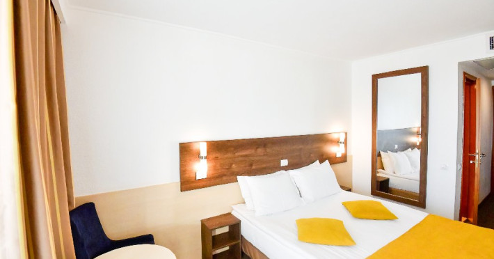 Dubla junior 4* si dubla superioara 4* corp Jupiter si Junona Dotari: pat matrimonial (160/200 cm) si 1 canapea fixa 70/150 cm, TV, AC, frigider minibar, grup sanitar, cabina de dus, articole pentru toaleta, Wi-Fi, uscator de par, papuci, suport bagaje. Capacitate: Dubla Junior este potrivita sa acomodeze un cuplu sau o familie cu 2 copii.