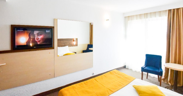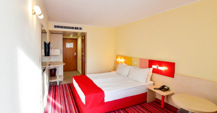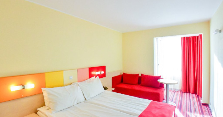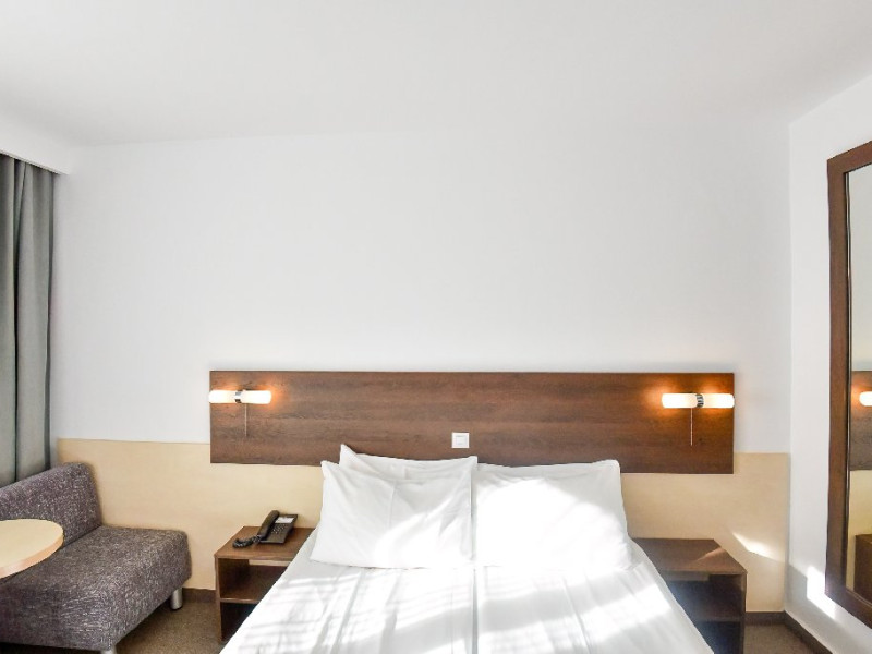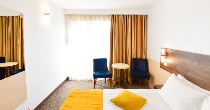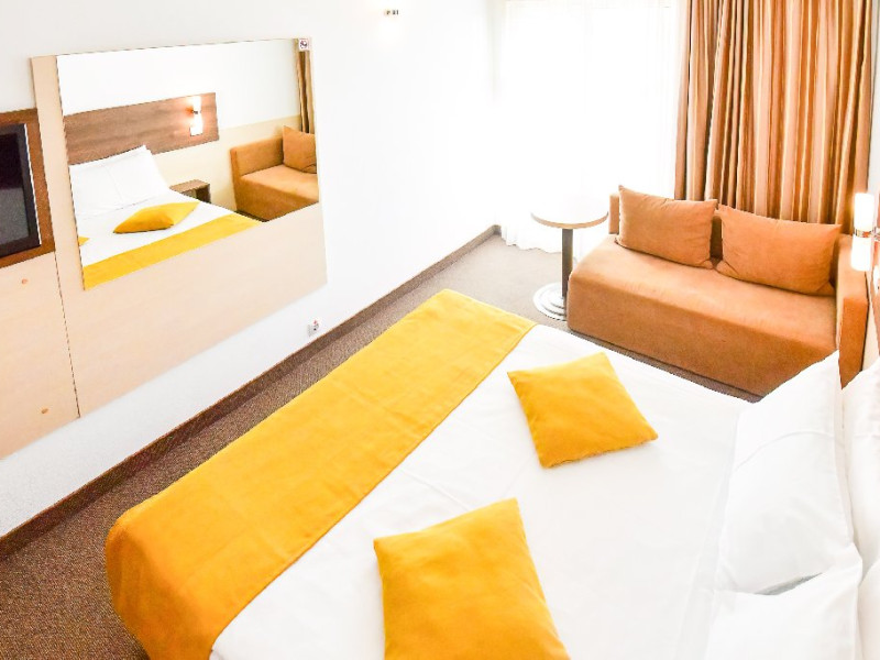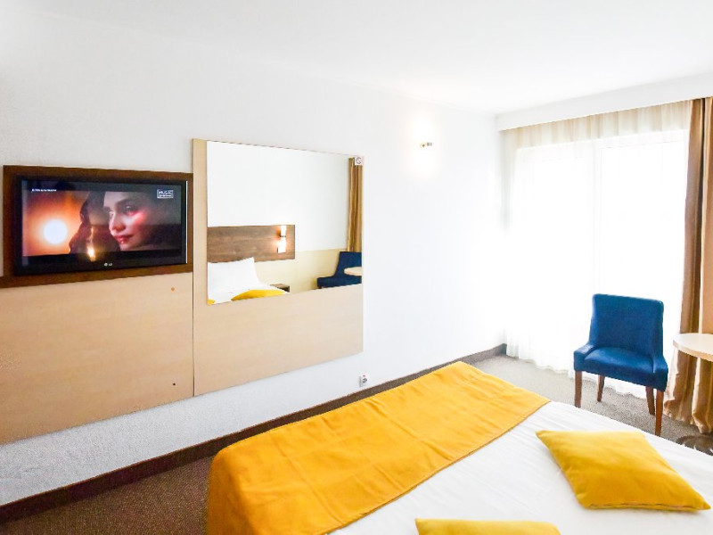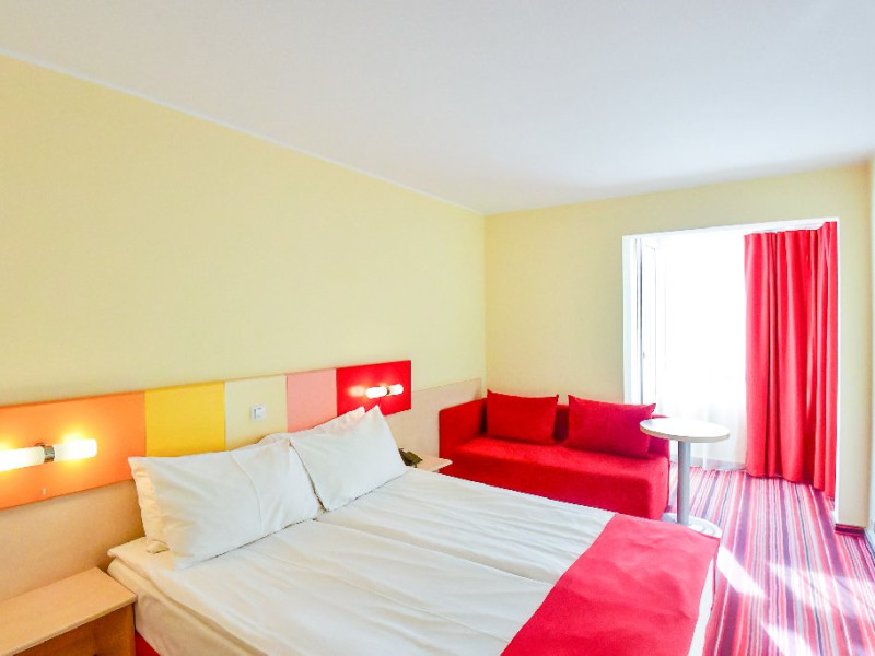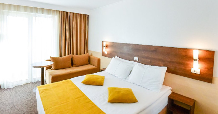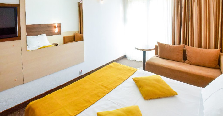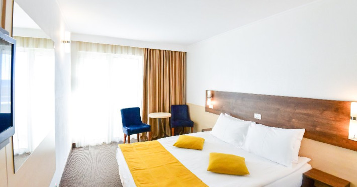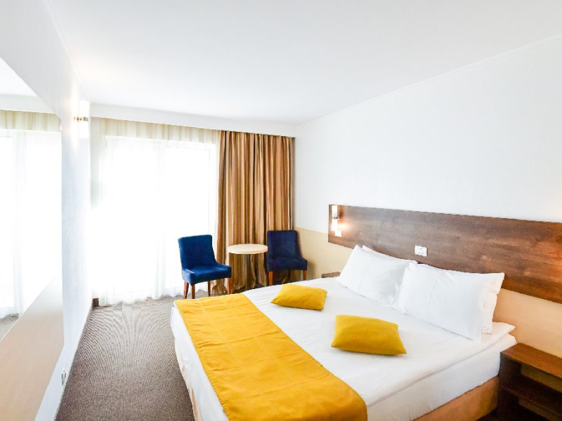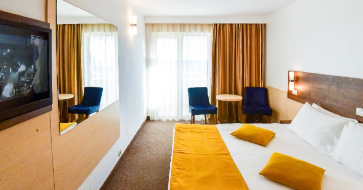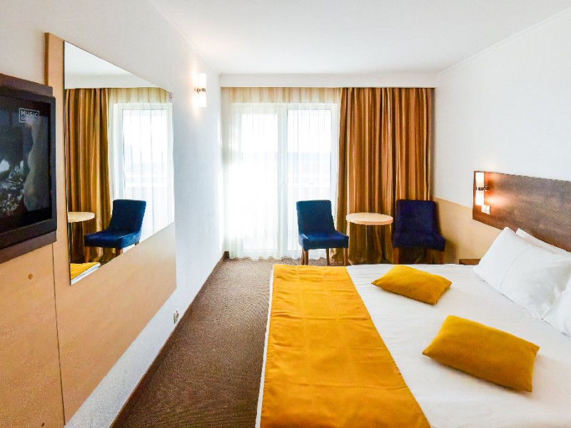 DESCRIERE CAMERE Dubla standard 4*/ superioara 4* cu pat queen/twin - corp Jupiter si Junona Dotari: pat matrimonial (160/200 cm sau 2 paturi twin de 90/200cm), TV, AC, frigider minibar, grup sanitar, cabina de dus, articole pentru toaleta, Wi-Fi, uscator de par, papuci, suport bagaje. Capacitate: Camera dubla este potrivita sa acomodeze un cuplu sau o familie cu un copil. Permite instalarea unui pat suplimentar pliant potrivit pentru o persoana (77x190 cm). Pentru copii de peste 12 ani, patul suplimentar este obligatoriu. Pentru doi adulti si doi copii de orice varsta, patul suplimentar este obligatoriu.
