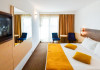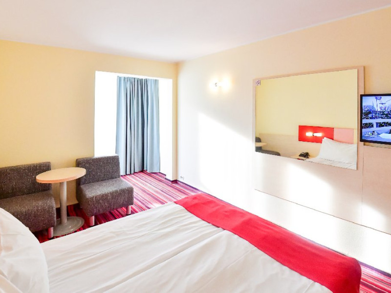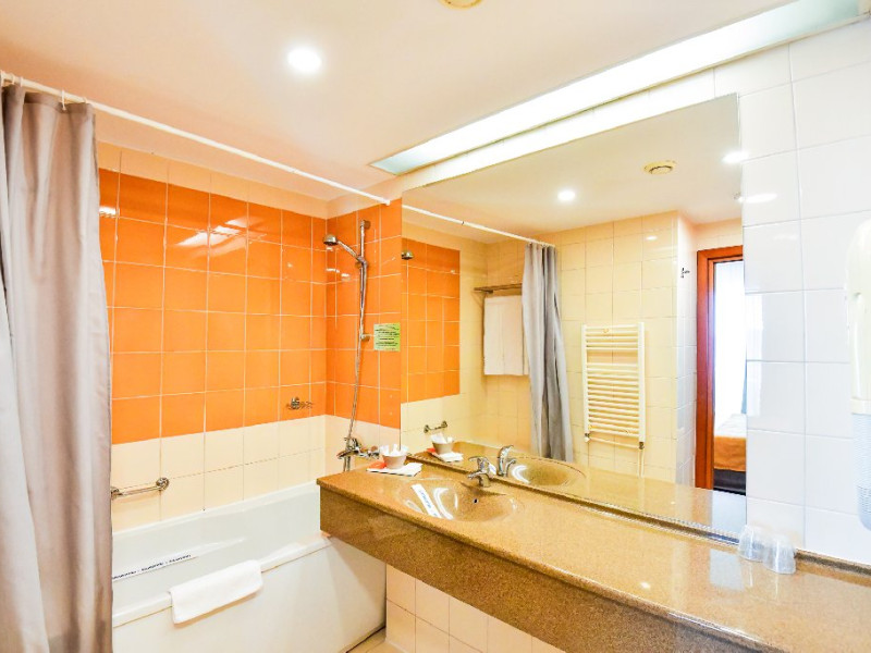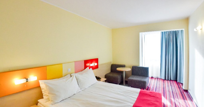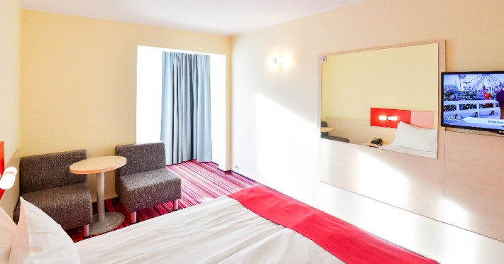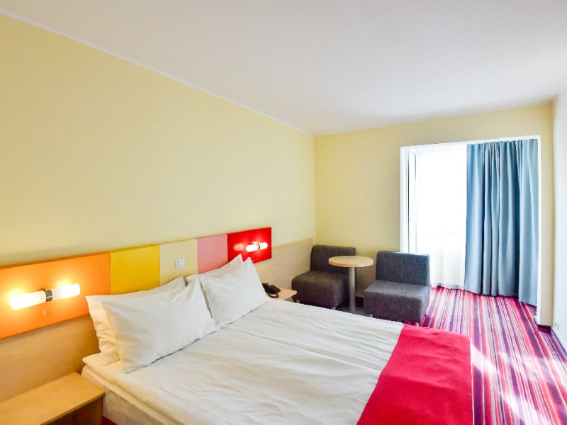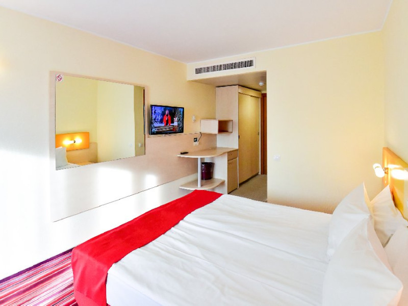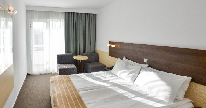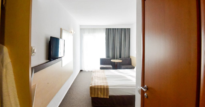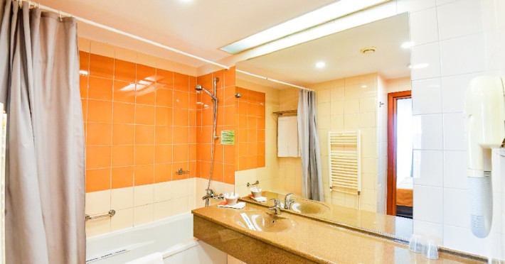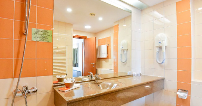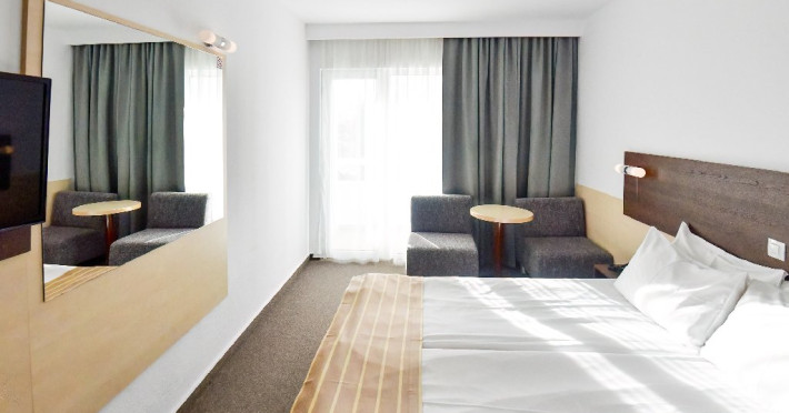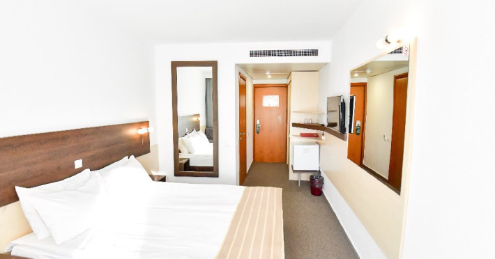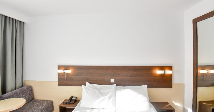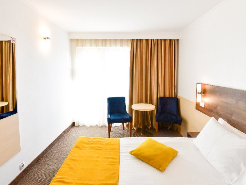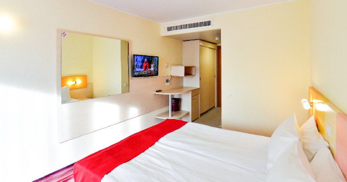 DESCRIERE CAMERE Dubla standard 4*/ superioara 4* cu pat queen/twin - corp Jupiter si Junona Dotari: pat matrimonial (160/200 cm sau 2 paturi twin de 90/200cm), TV, AC, frigider minibar, grup sanitar, cabina de dus, articole pentru toaleta, Wi-Fi, uscator de par, papuci, suport bagaje. Capacitate: Camera dubla este potrivita sa acomodeze un cuplu sau o familie cu un copil. Permite instalarea unui pat suplimentar pliant potrivit pentru o persoana (77x190 cm). Pentru copii de peste 12 ani, patul suplimentar este obligatoriu. Pentru doi adulti si doi copii de orice varsta, patul suplimentar este obligatoriu.