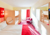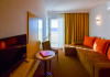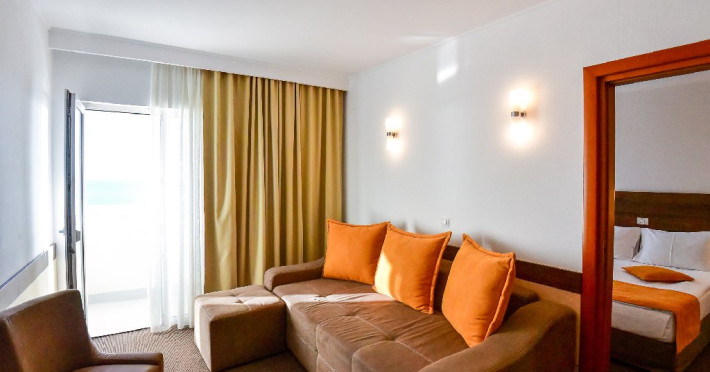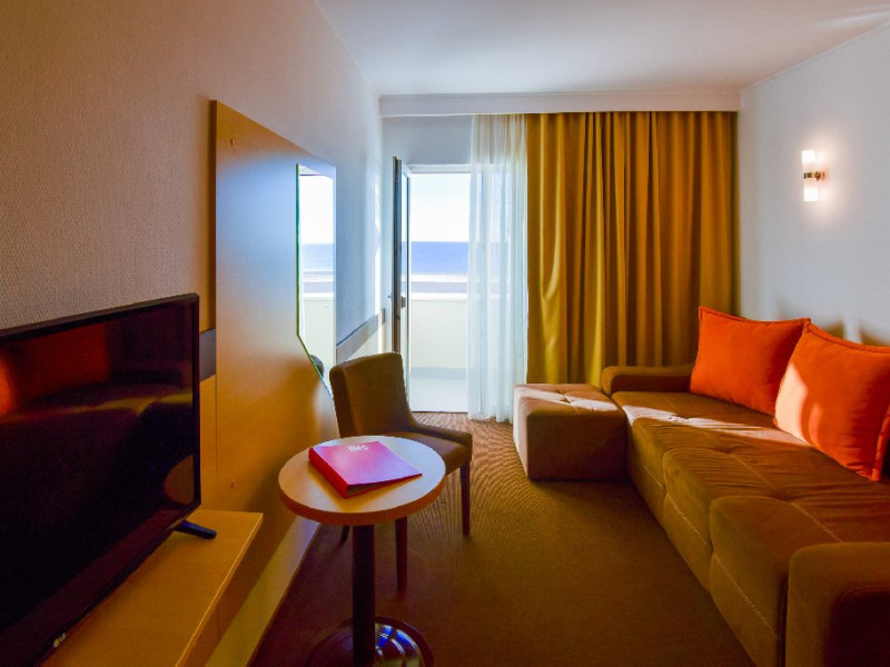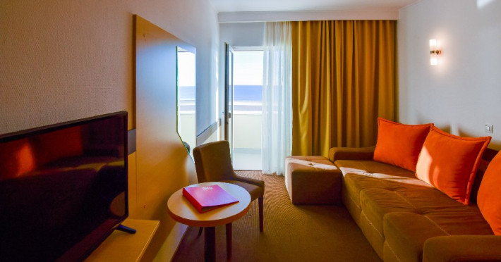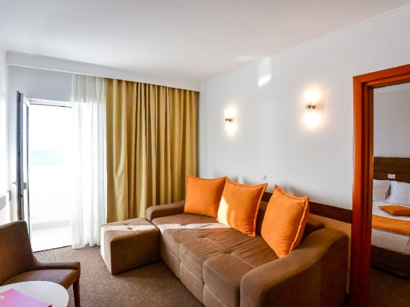 Apartament cu vedere la mare 4* corp Junona Are o priveliste panoramica, superba catre mare iar oaspetii care achizitioneaza acest spatiu de cazare, beneficiaza de acces gratuit in centrul Spa la serviciile de sauna si salina. Dotari: pat matrimonial (160/200 cm), canapea extensibila (160/190 cm) , TV, AC, frigider minibar, grup sanitar, baie cu cada, articole pentru toaleta, seif, uscator de par, Wi-Fi, toaleta de serviciul. Capacitate: Apartamentul este potrivit sa acomodeze o familie cu doi copii. In dormitor este prezent un pat matrimonial 160x200 cm, si in living o canapea extensibila care poate acomoda doua persoane. Livingul si dormitorul sunt despartite de o usa.