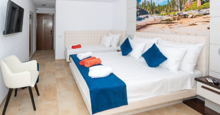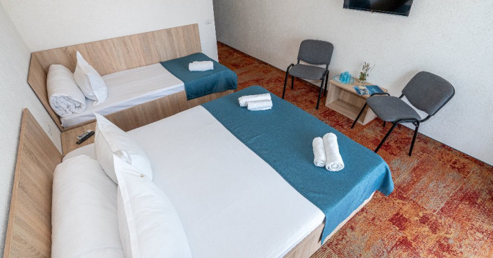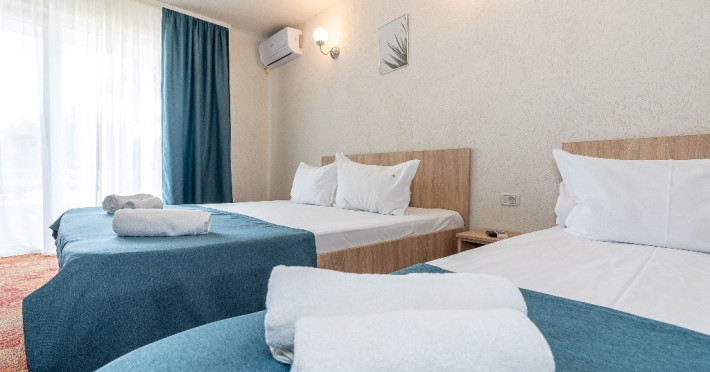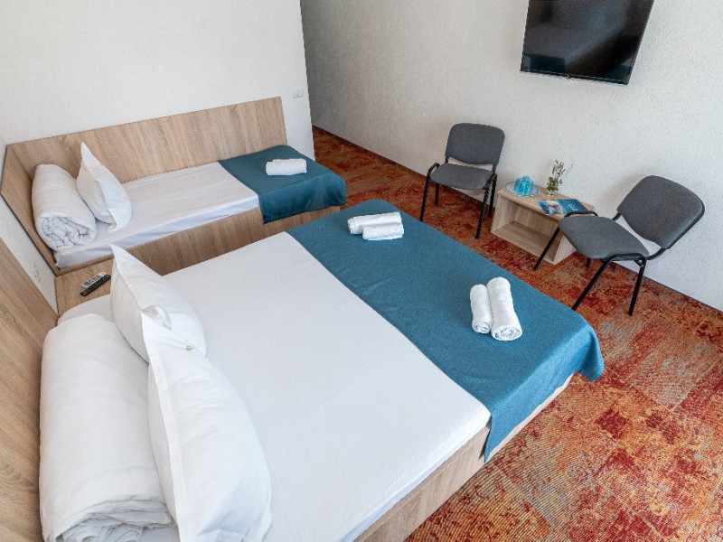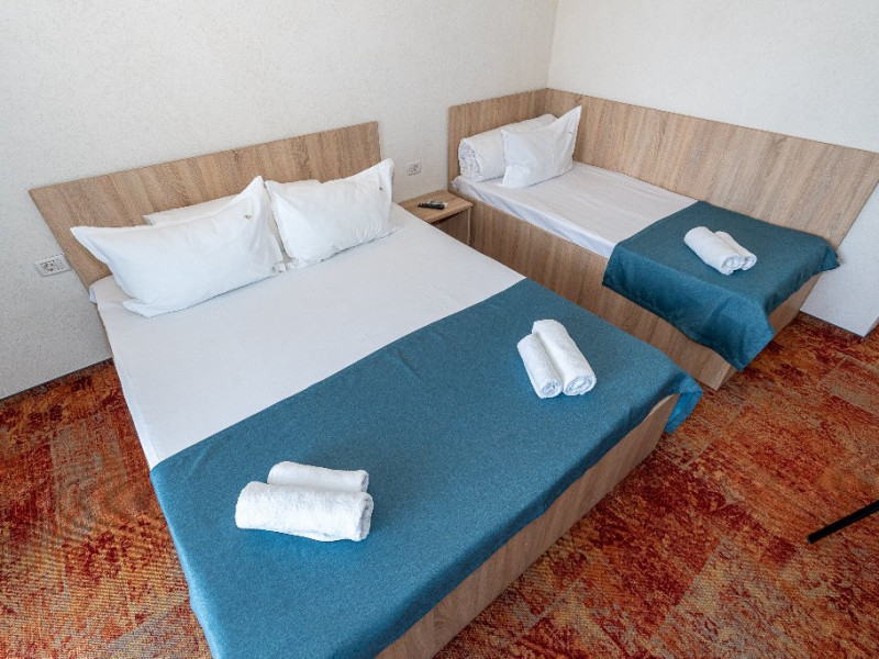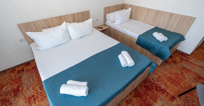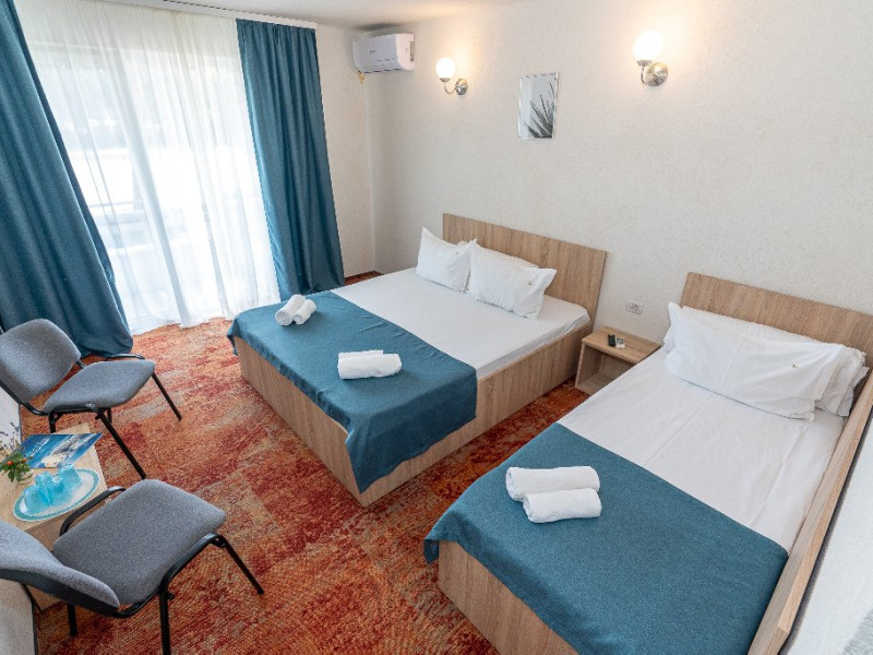 Camera Tripla matrimoniala are un pat matrimonial (160/200 cm) si un pat individual ( 100/200 cm). Recomandare: Camera tripla este destinata cazarii a 2 adulti si 2 copii sau a 3 adulti. Dotari: sistem de acces in camera pe baza de cartela/cod de acces, aer conditionat, TV LCD, seif, baie cu cabina de dus, cosmetice hoteliere, balcon cu mobilier de terasa pentru camerele situate la etaj.