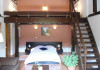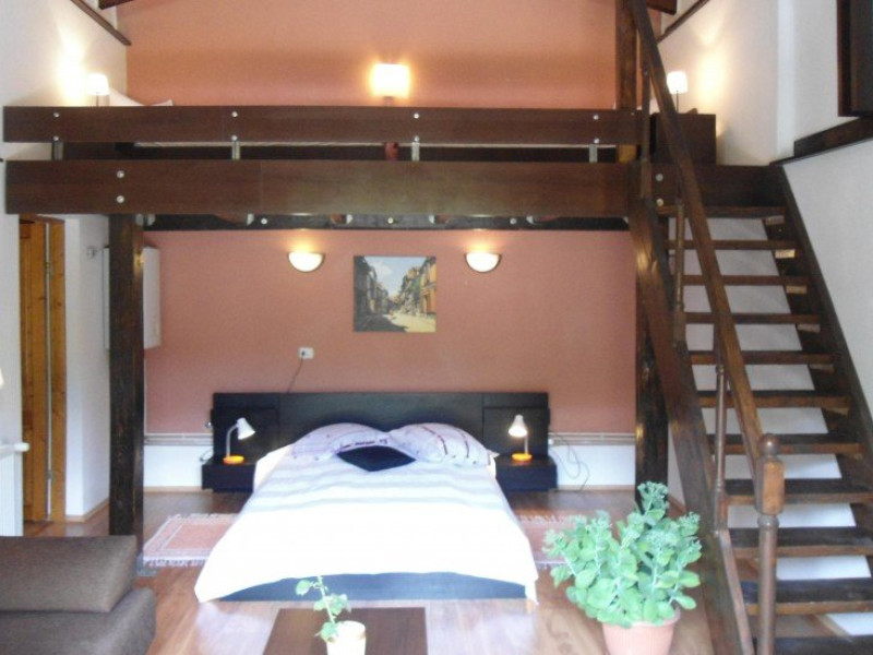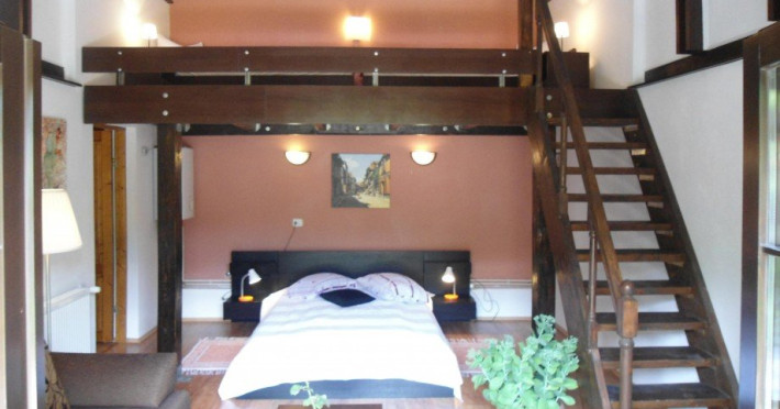 APARTAMENT DOUA CAMERE Apartametul este format dintr-o camera de zi cu scara interioara si supanta, un dormitor, hol si o baie. Camera de zi are o arhitectura speciala si o suprafata generoasa de circa 24 mp pe parter si cu o supanta la etaj de circa 10 mp. Tavanul livingului si al dormitorului este inclinat, cu grinzi de lemn aparente. Intrarea in apartament se face prin living, dar dormitorul dispune si de o intrare directa, separata, din pridvor. Pridvorul din fata apartamentului este generos , cu fotolii/canapea si masuta, si are deschiderea spre gradina de flori a pensiunii . Apartamentul este adaptat pentru a primi persoane cu dizabilitati. La parter, livingul are o canapea extensibila, fotoliu, masuta de cafea, masa pentru 6 persoane, TV color, minibar. La supanta sunt amplasate 2 paturi de cate o persoana (90x200cm). Dormitorul este mobilat cu un pat matrimonial , 2 noptiere, 2 fotolii, masuta de cafea, plasma TV. Dulapul este amplasat in holul dintre living si dormitor. Din hol se intra in baie . Baia are cabina de dus cu hidromasaj. In acest apartament se pot caza maxim 3 adulti si 2 copii sau 2 adulti si 3 copii.