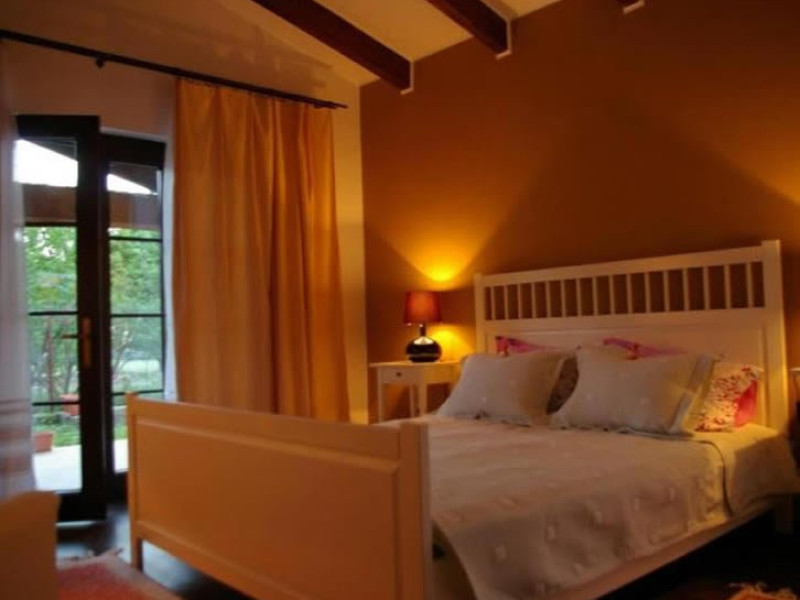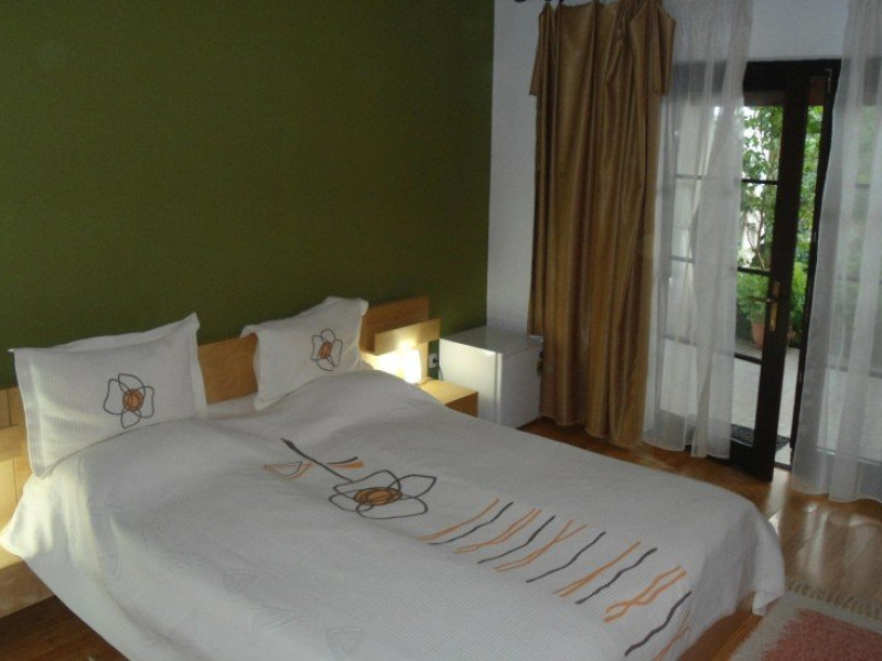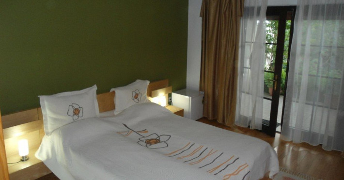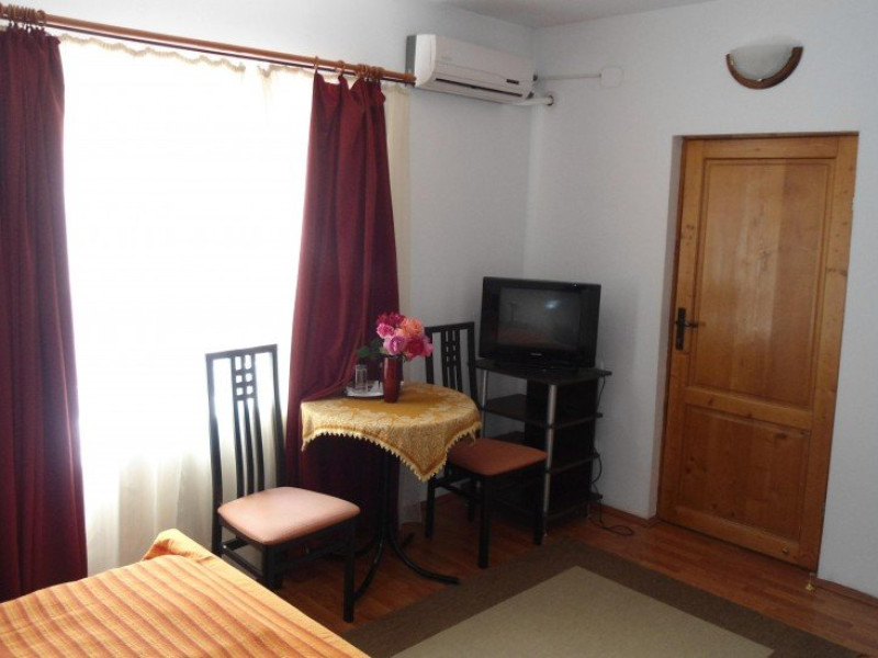 DESCRIERE CAMERE CAMERA DUBLA MATRIMONIALA Camera dubla matrimoniala dispune de un pat matrimonial extra large (180x200cm) si vedere spre gradina, fiind amplasata la parterul pensiunii. Suprafata camerelor este de 18 mp. Numarul maxim de persoane ce pot fi cazate intr-o camera dubla cu pat martimonial sunt - 2 adulti si 1 copil cu varsta pana 7 ani. Camera este adaptata pentru a primi persoane cu dizabilitati. Pridvorul comun din fata camerelor este generos si cu deschidere spre gradina de flori. Tavanul camerelor este inclinat, cu grinzi de lemn aparente.