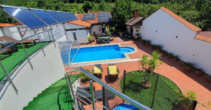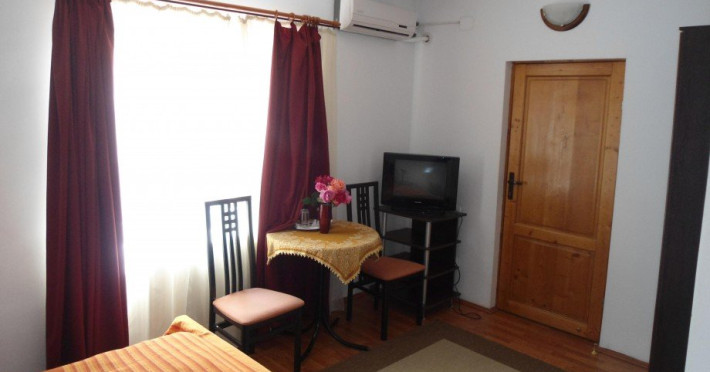 CAMERA DE FAMILIE Camera de familie este o camera cu arhitectura speciala, cu o suprafata generoasa de 24 mp pe parter si cu o supanta la etaj de circa 10 mp. Legatura intre parter si supanta de la etaj se face printr-o scara interioara din lemn. Pridvorul comun din fata camerelor, mobilat cu mobilier de gradina, este generos si cu deschidere spre gradina de flori a pensiunii. In camera de la parter este dispus un pat matrimonial extra large (180x200xm) cu noptiere, o canapea extensibila (140x200cm), masuta cafea, fotoliu extensibil. Dulapul pntru haine este amplasat in holul de legatura cu grupul sanitar. Camera este adaptata pentru a primi persoane cu dizabilitati. In supanta sunt amplasate 2 paturi de cate o persoana, cu noptiere, cu dimensiunile (90x200cm). Numarul maxim de persoane care se pot caza intr-o astfel de camera, este de 3 adulti si 1 copil cu varsta pana la 14 ani, sau de 2 adulti si doi/trei copii