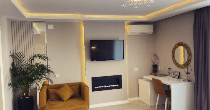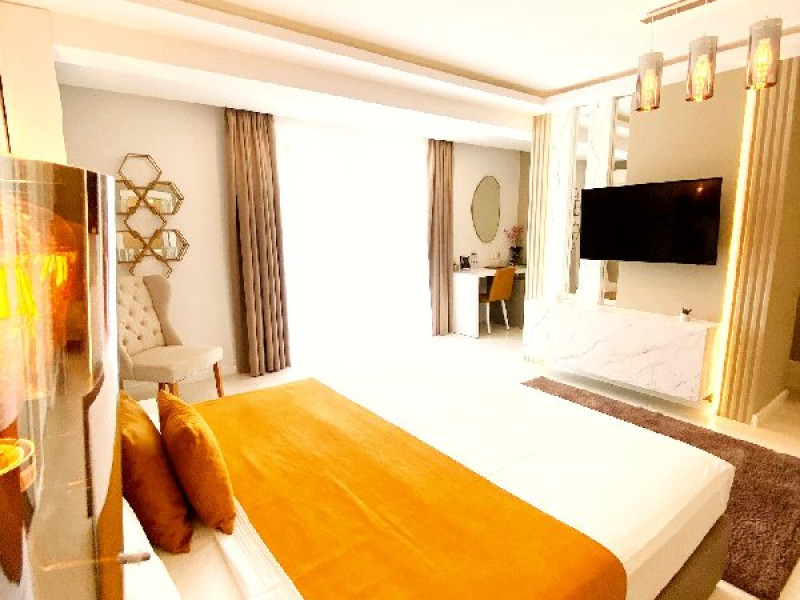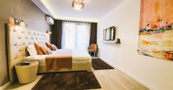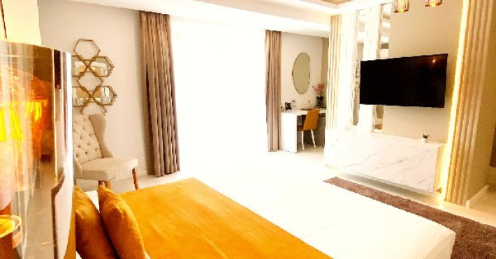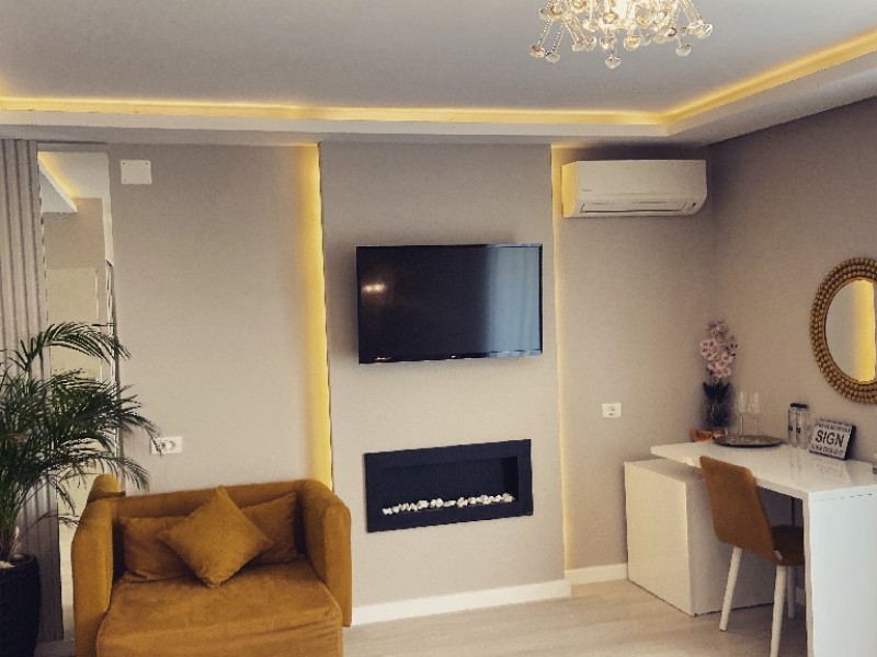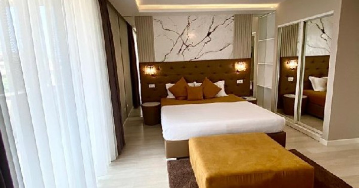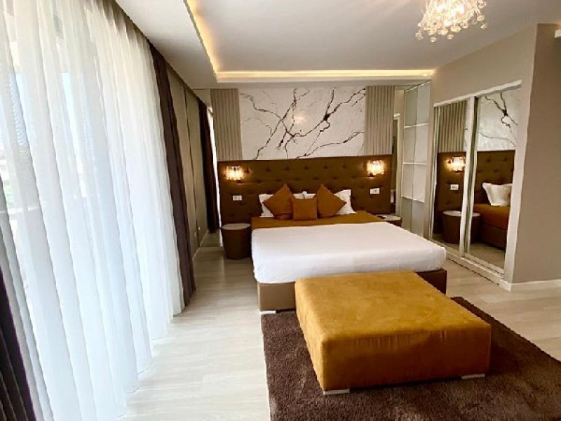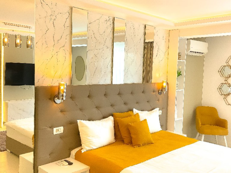 DESCRIERE CAMERE Dotari camere: TV 106 CM LED Smart si Netflix, minibar, uscator de par, pat de 180X200, exista si varianta de a adauga un pat suplimentar (extensibil), pret 30 Lei/ zi, aer conditionat, cosmetice baie.
