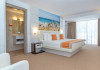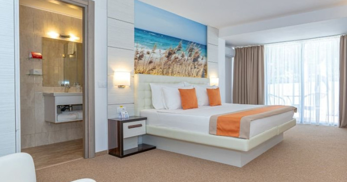 Junior Suite in hotel cu vedere mare (sunt situate de la etajul 4), cu o suprafata de 28.44 mp, sunt alcatuite din living cu canapea extensibila 160x200 cm) si dormitor cu pat matrimonial (180x190 cm). Fiecare camera dispune de baie proprie si balcon. Pot gazdui 2 adulti si 2 copii sau 3 adulti. Nu se accepta adaugarea de pat suplimentar.