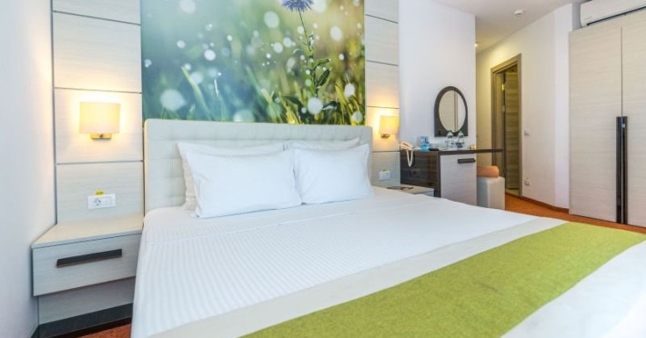 Junior Suite in hotel etaj inferior(sunt situate doar la etajele inferioare 1-2-3), cu o suprafata de 28.44 mp, sunt alcatuite din living cu canapea extensibila 160x200 cm) si dormitor cu pat matrimonial (180x190 cm). Fiecare camera dispune de baie proprie si balcon. Pot gazdui 2 adulti si 2 copii sau 3 adulti. Nu se accepta adaugarea de pat suplimentar.