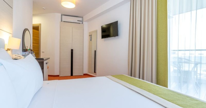Camerele duble matrimoniala in hotel cu vedere mare cu o suprafata de 15,20 mp, pat matrimonial (180/190 cm), sistem de acces pe baza de cartela, baie cu dus, aer conditionat, balcon cu scaune si masuta, seif, televizor LCD, internet,, telefon, minibar (produse contra cost), uscator de par, cosmetice hoteliere, prosoape pentru plaja, uscator de rufe, mocheta.