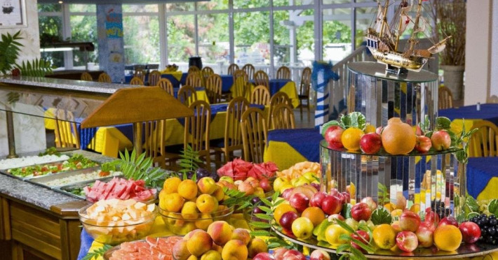 Programul All Inclusive incepe cu masa intermediara in ziua sosirii si se termina cu pranzul in ziua plecarii. Check in: Dupa ora 14:00 Check out: Pana la ora 11:00 Mancare si bautura: Restaurant principal - Oasis - Restaurantul ofera un meniu variat de 7 zile, mancaruri vegetariene, mancaruri sanatoase, produse de productie proprie si SHO W cooking. Mic dejun: 07:30 - 10:00 restaurant Oasis Pranz: 12:30 - 14:30 restaurant Oasis Gustari (snack bar): 15:00 - 17:00 (dulciuri, fructe, inghetata) Snack bar Oasis Cina: 18:00 - 21:00 restaurant Oasis * Inghetata este disponibila in timpul meselor in restaurantul principal si la snack bar. ** Cina cu gratar - de 6 ori pe saptamana (01.07 - 31.08). *** Cina tematica - de 2 ori pe luna. **** Tineti cont de faptul ca unele dintre hoteluri ar putea schimba usor orele in functie de nationalitatile specifice cazate acolo, dar cu cel mult 30 de minute +/- . Bauturi All Inclusive: cafea si ceai, bauturi racoritoare din post mix, o selectie de bauturi produse in Albena, cum ar fi suc, vin si raki, o selectie de vinuri la robinet, o selectie de bauturi spirtoase locale si bere la halba. * Toate bauturile imbuteliate si o selectie de bauturi alcoolice importate si/sau premium sunt disponibile la un cost suplimentar. * Dupa ora 23:00 toate bauturile sunt contra cost. Baruri all inclusive: Lobby bar: 10:00 - 23:00 h Bar la piscina: 10:00 - 22:00