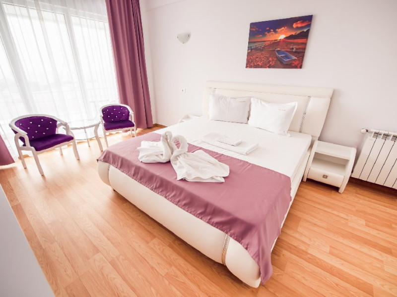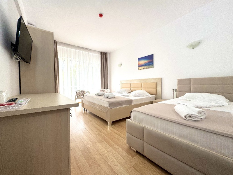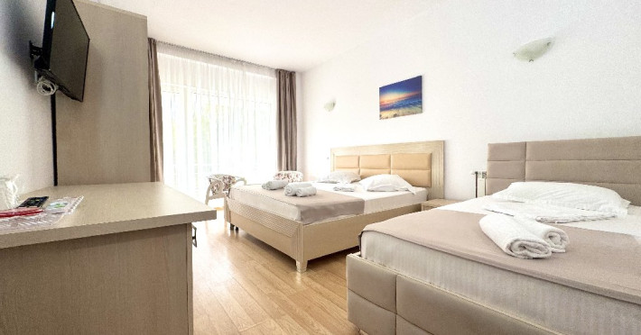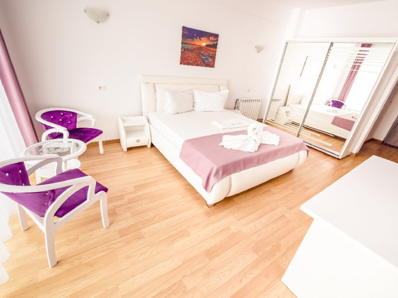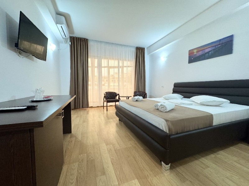 DESCRIERE CAMERE Dotari camere: aer conditionat, TV- LCD, minibar, baie cu dus, internet wi-fi, telefon, balcon, seif, uscator de par, plasa de tantari. 92 camere cu vedere frontala la mare, dar si la promenada statiunii. In functie de preferinte, puteti alege intre camere duble, family sau studiouri.