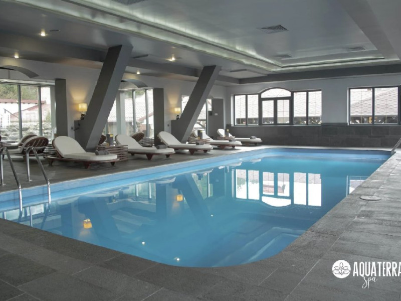 FACILITATI: Servicii AQUATERRA SPA La AQUATERRA SPA beneficiati de: Piscina incalzita interioara pentru adulti Piscina incalzita interioara copii hidromasaj cu apa de izvor plaja exterioara sauna umeda sauna uscata finlandeza cu sare de Himalaya Servicii extra: sauna ruseasca - exterioara ciubar exterior masaje tratamente Piscina este functionala tot timpul anului. Salon masaj si tratament- pe baza de programare, unde puteti beneficia de diverse tratamente sau masaje de relaxare.