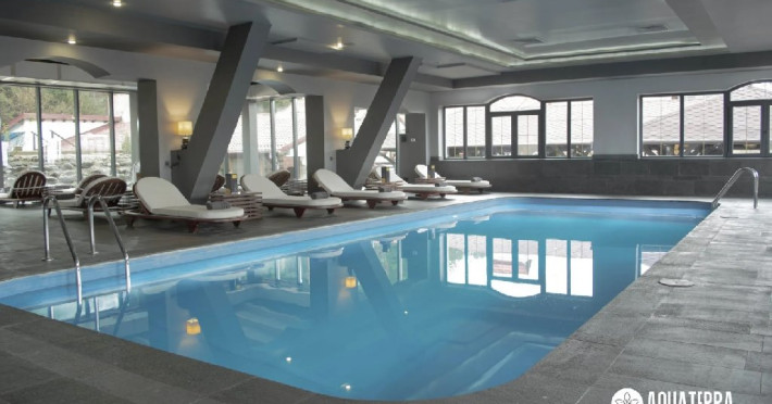 FACILITATI: Servicii AQUATERRA SPA La AQUATERRA SPA beneficiati de: Piscina incalzita interioara pentru adulti Piscina incalzita interioara copii hidromasaj cu apa de izvor plaja exterioara sauna umeda sauna uscata finlandeza cu sare de Himalaya Servicii extra: sauna ruseasca - exterioara ciubar exterior masaje tratamente Piscina este functionala tot timpul anului. Salon masaj si tratament- pe baza de programare, unde puteti beneficia de diverse tratamente sau masaje de relaxare.