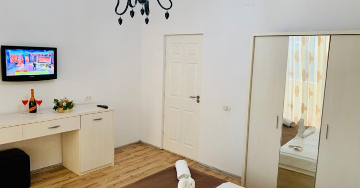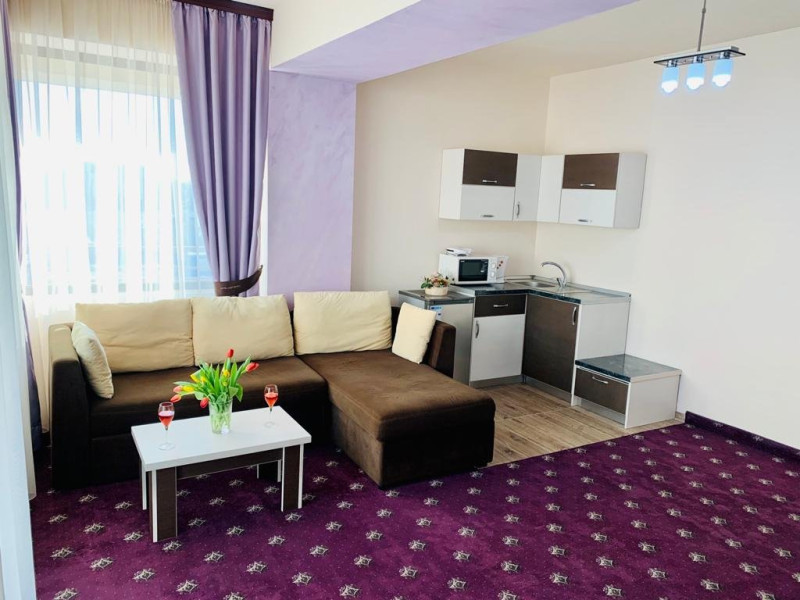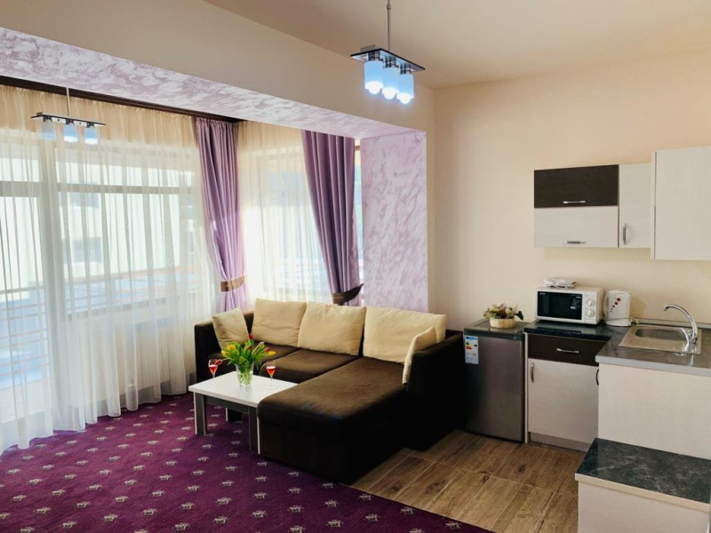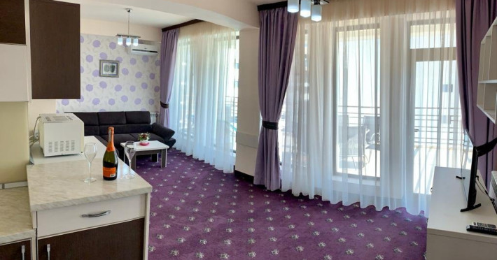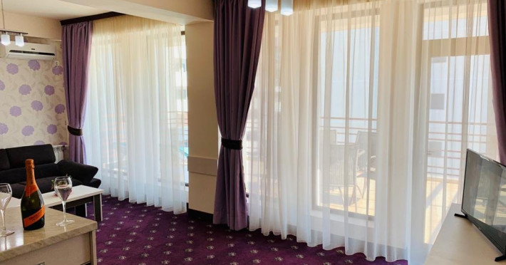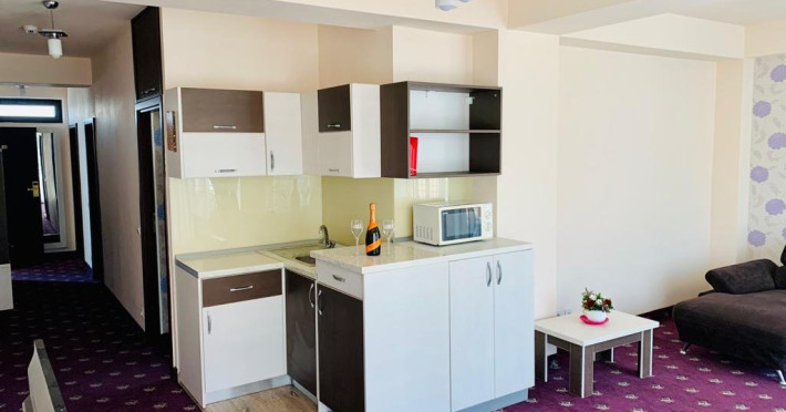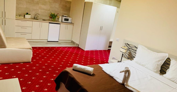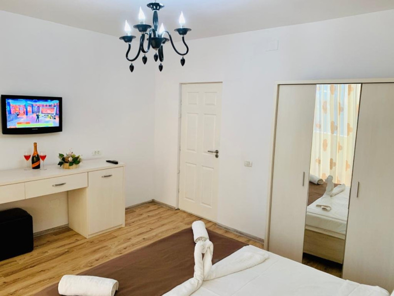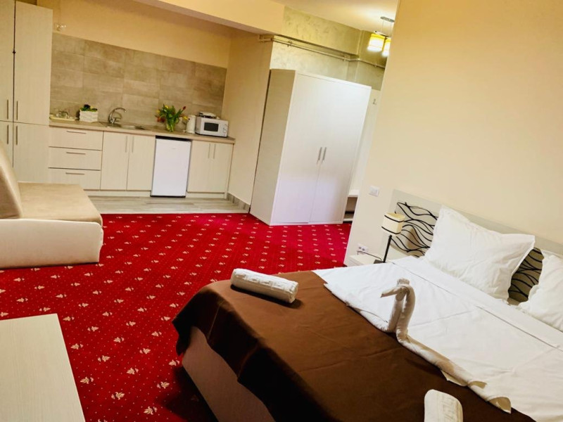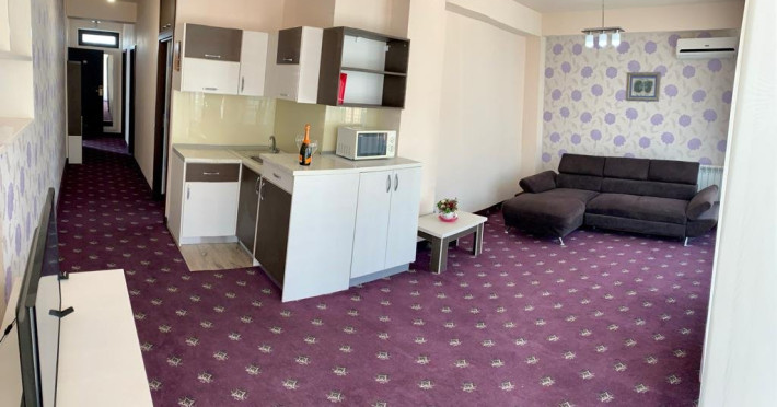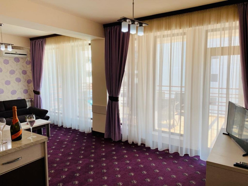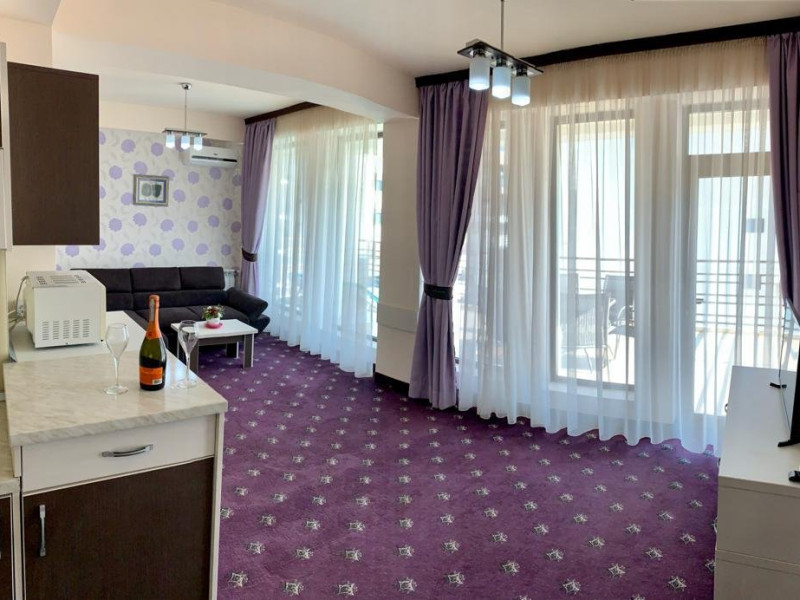 Apartamente deluxe cu 2 camere (living si dormitor ) dotate in living cu canapea extensibila, aer conditionat, tv lcd, chicineta (mobilier de bucatarie,cuptor cu microunde, toaster, aparat de incalzit apa, chiuveta), mocheta, iar in dormitor pat matrimonial 160/200, aer conditionat, tv lcd, baile sunt dotate cu cabine de dus si uscator de par, suprafata apartamentului in jur de 55-60mp.