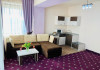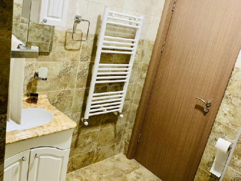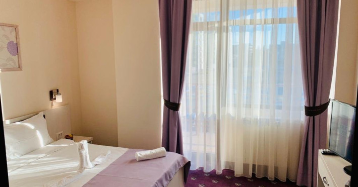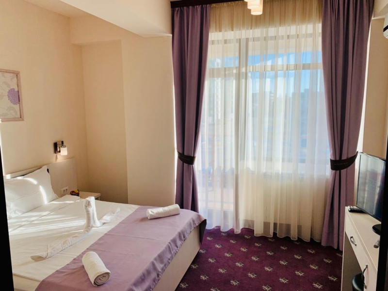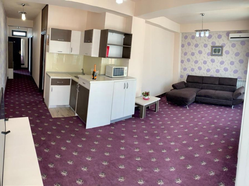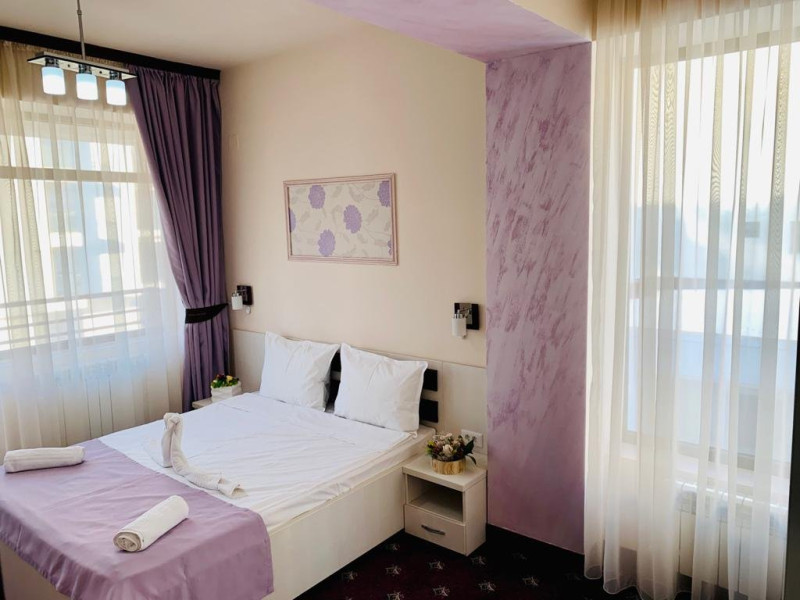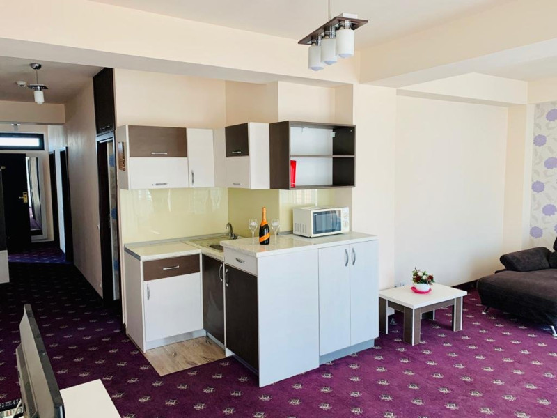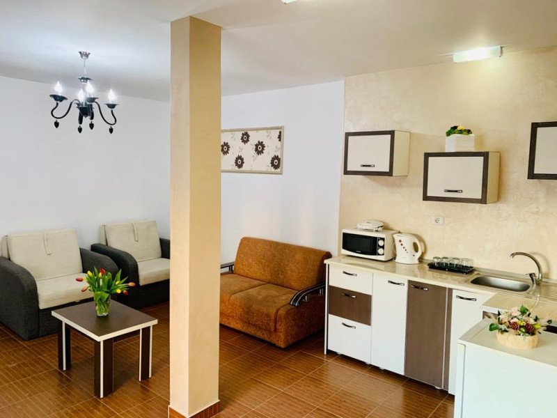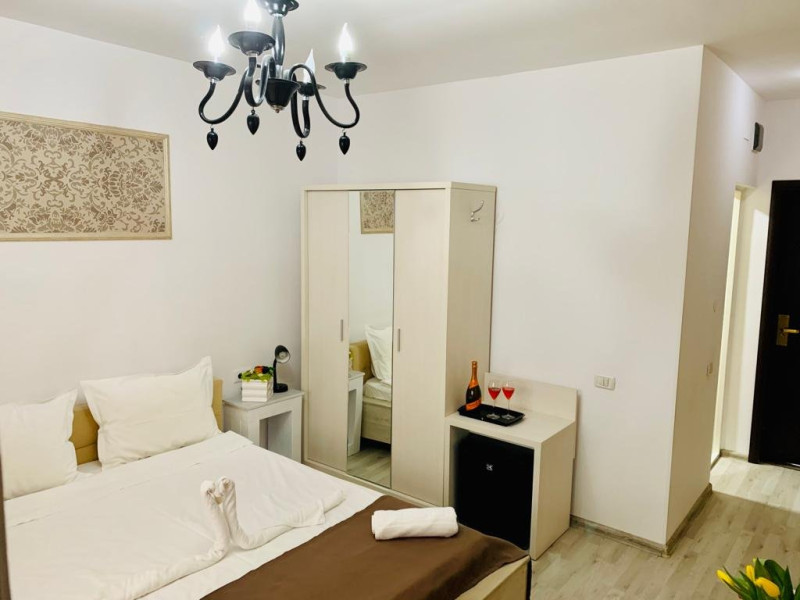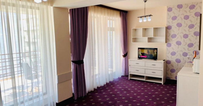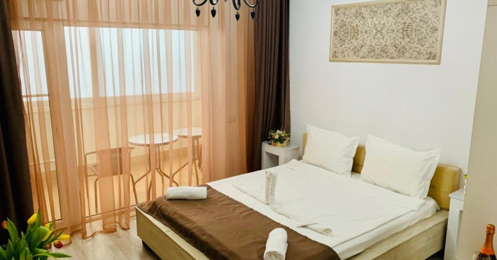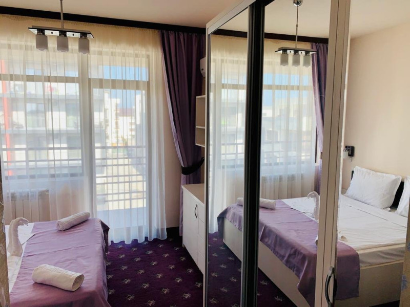 Apartamente deluxe cu 2 camere (living si dormitor ) dotate in living cu canapea extensibila, aer conditionat, tv lcd, chicineta (mobilier de bucatarie,cuptor cu microunde, toaster, aparat de incalzit apa, chiuveta), mocheta, iar in dormitor pat matrimonial 160/200, aer conditionat, tv lcd, baile sunt dotate cu cabine de dus si uscator de par, suprafata apartamentului in jur de 55-60mp.