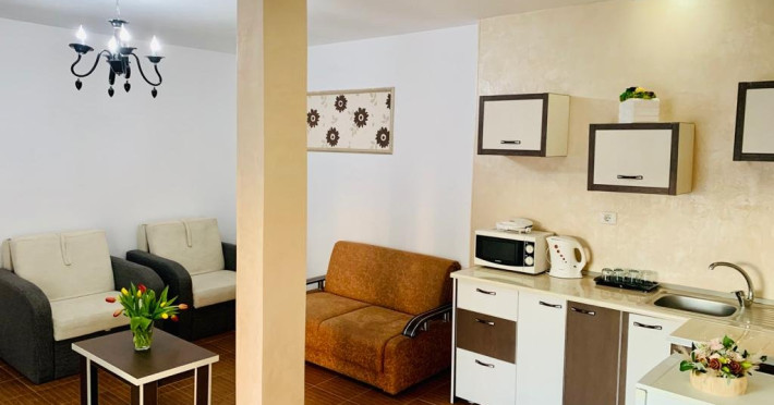 Apartamentele standard compuse din (living si dormitor ) dotari si suprafata: tv lcd (in ambele camere), aer conditionat (in living si dormitor), frigider, chicineta (mobilier bucatarie cu chiuveta, cuptor cu microunde, toaster, aparat de incalzit apa), pat matrimonial in dormitor 160/200, canapea extensibila in living, suprafata apartament in jur de 40mp.