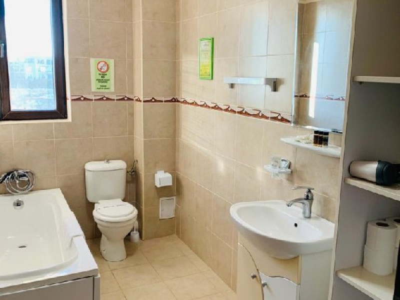 Apartamente cu 3 camere 65mp (living si 2 dormitoare ), living: mocheta, canapea extensibila, aer conditionat, tv lcd, chicineta (mobilier de bucatarie,cuptor cu microunde, toaster, aparat de incalzit apa), dormitoare: pat matrimonial de 160/200, mocheta, aer conditionat, TV Lcd. Baile sunt dotate cu cabina de dus si uscator de par.