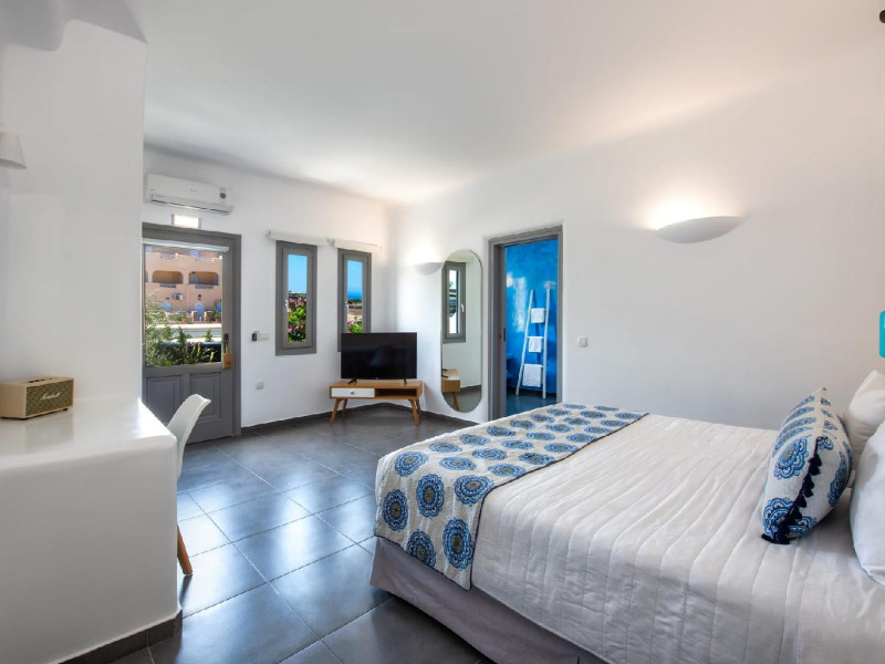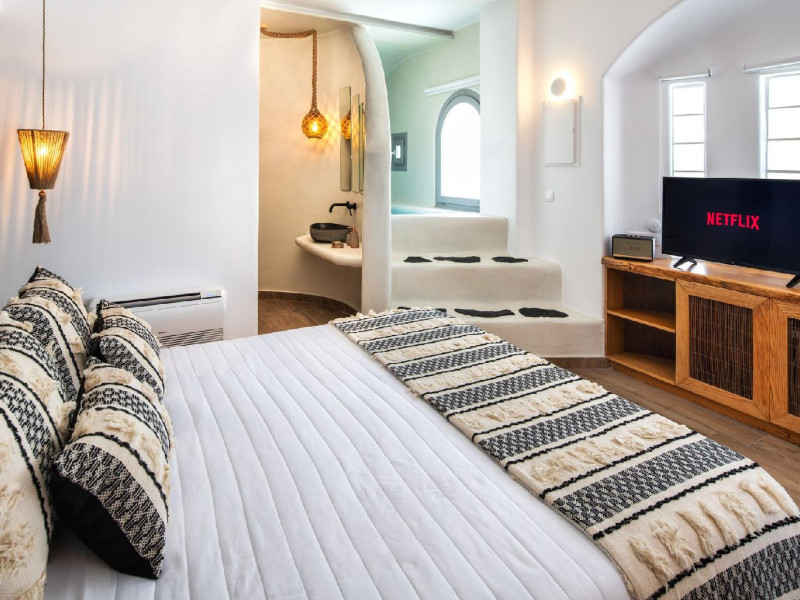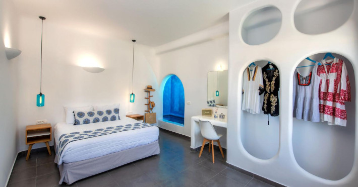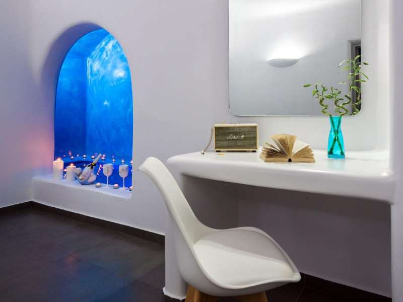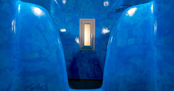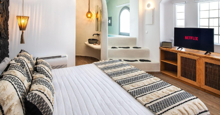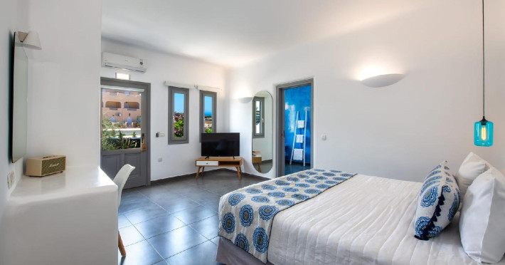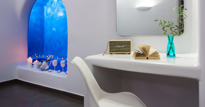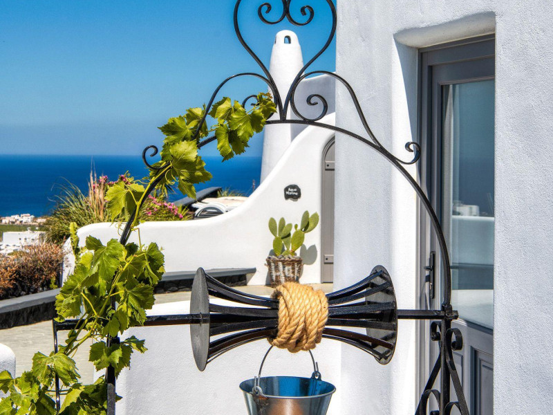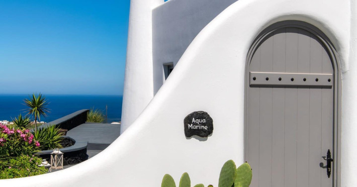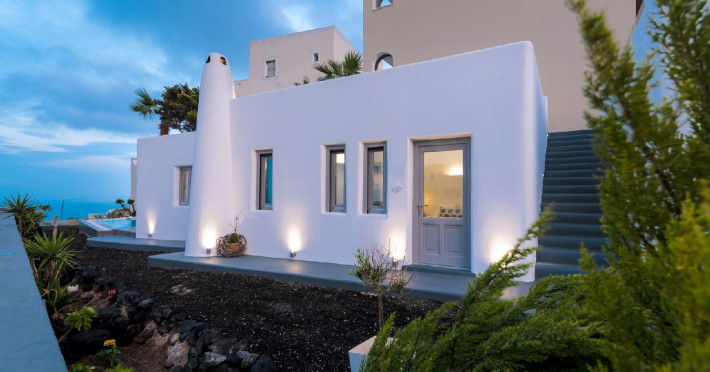 The San Marino Suites is brand new complex of luxurious suites located east of Fira. The suites are built on a slope filled with colorful, traditional houses and churches, in a verdant garden with views to the azure blue of the Aegean Sea. The San Marino Suites is just a few steps away from Santorini’s capital, Fira and features six spacious suites, a range of modern amenities and comfortable facilities. The suites are ideal for couples seeking a romantic getaway, families looking for a secure and comfortable family retreat or even international celebrities casting about for high-end accommodation that ensures privacy and serenity during their stay in Santorini.
