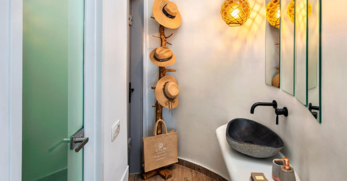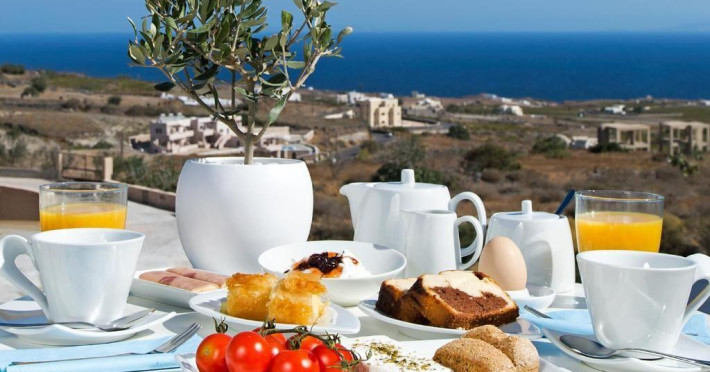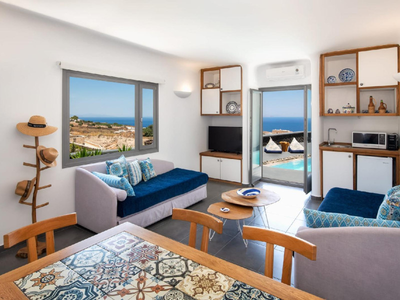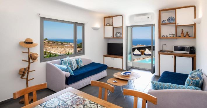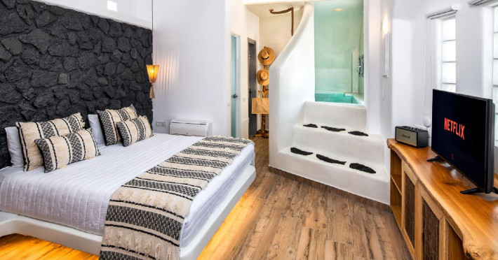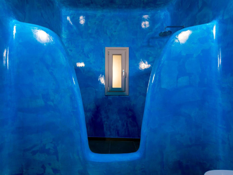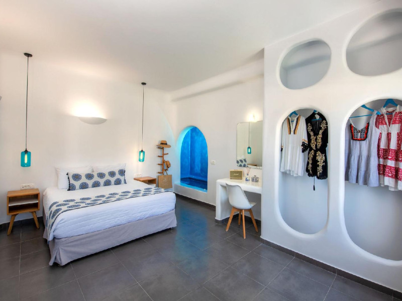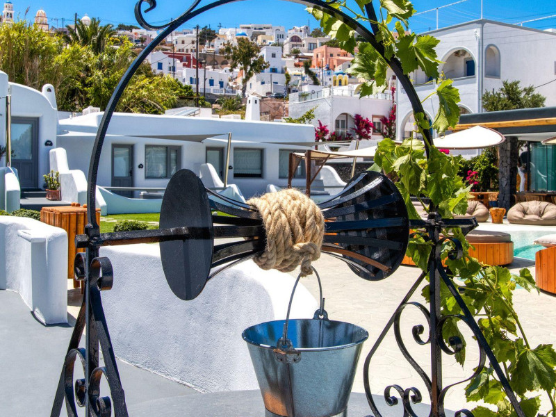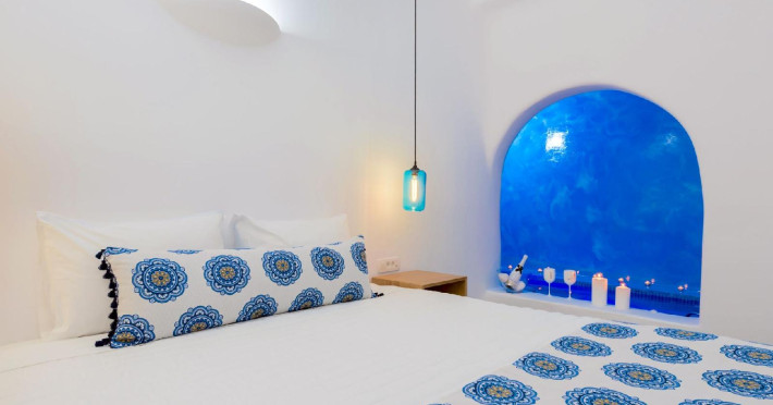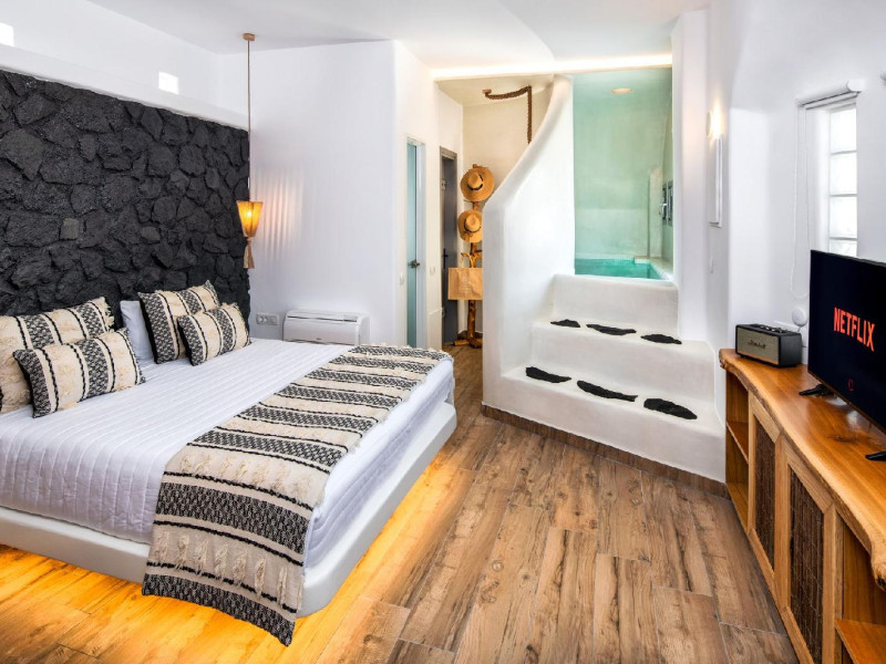 The San Marino Suites is brand new complex of luxurious suites located east of Fira. The suites are built on a slope filled with colorful, traditional houses and churches, in a verdant garden with views to the azure blue of the Aegean Sea. The San Marino Suites is just a few steps away from Santorini’s capital, Fira and features six spacious suites, a range of modern amenities and comfortable facilities. The suites are ideal for couples seeking a romantic getaway, families looking for a secure and comfortable family retreat or even international celebrities casting about for high-end accommodation that ensures privacy and serenity during their stay in Santorini.