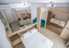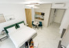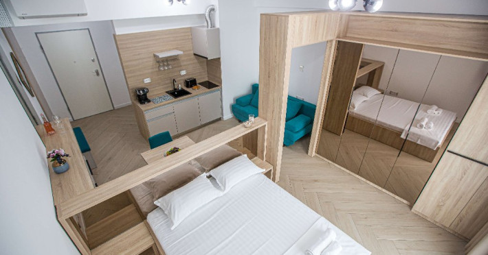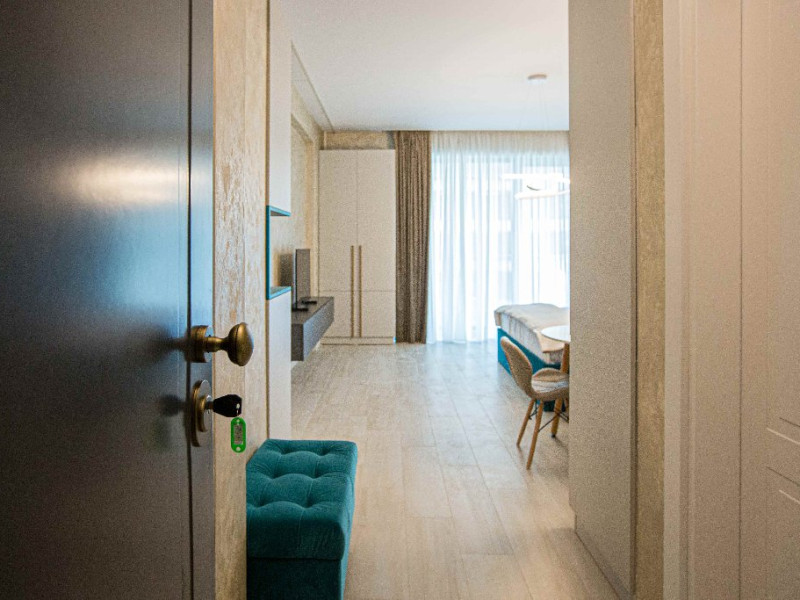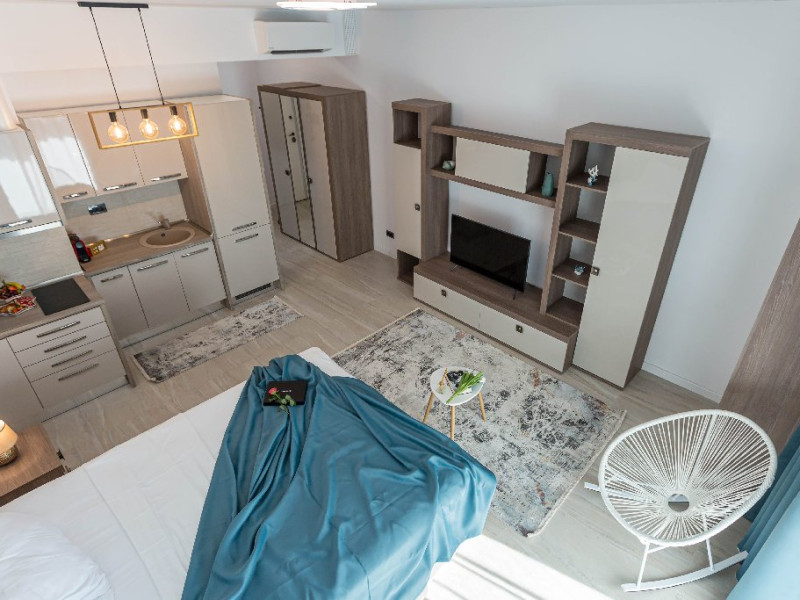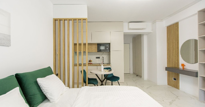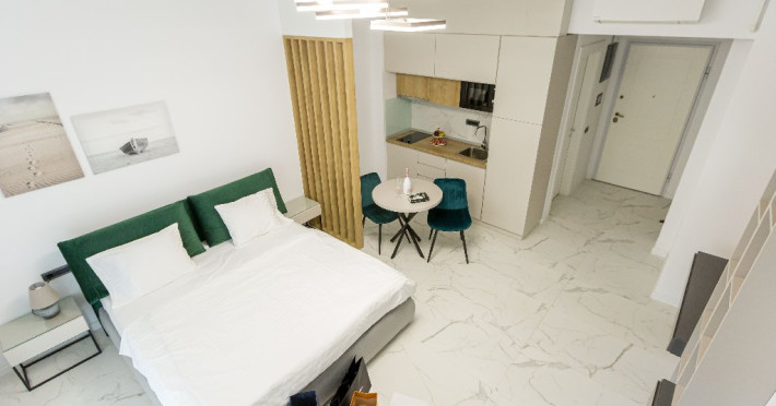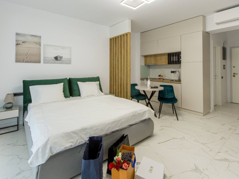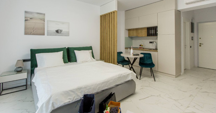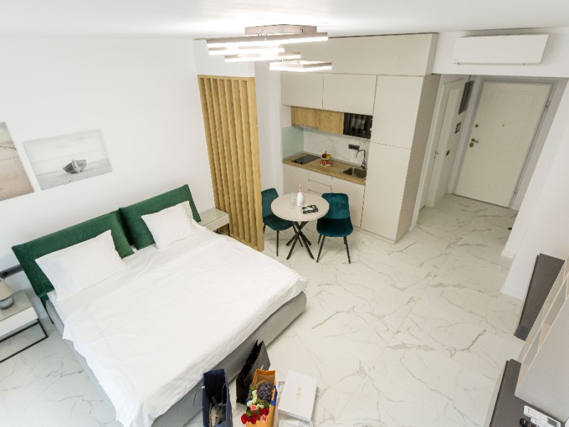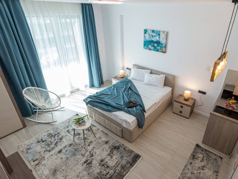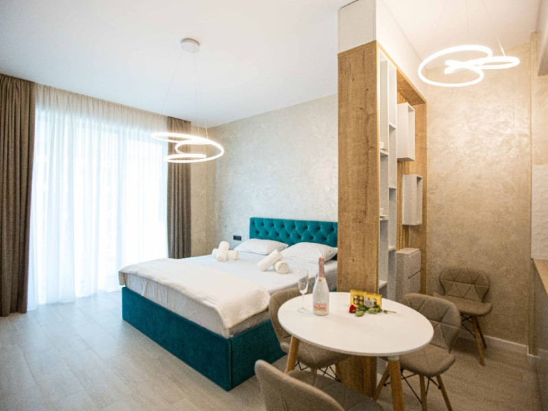 STUDIO Un studio cu vedere laterala sau frontala la mare, proiectat inteligent, avand un spatiu generos, design modern si personalizat. Este complet echipat, dispune de sistem smart Home, mobilier de inalta calitate, oferind confort, functionalitate si rasfat. Pune la dispozitie un spatiu deschis, cu bucatarie utilata, loc de luat masa si zona de dormit. Patul este primitor, cu saltea de inalta calitate si asternuturi din materiale premium, pentru maximum de relaxare si odihna. Studio-urile dispun de terase, unde va puteti bucura de briza marii, savurand cafeaua de dimineata sau admirand luna rasarind din mare. Capacitate: Nr. maxim adulti: 2 Nr. maxim copii (0- 9 ani): 2 Suprafata studio: intre 37 si 42 mp