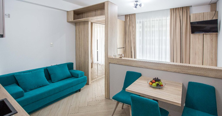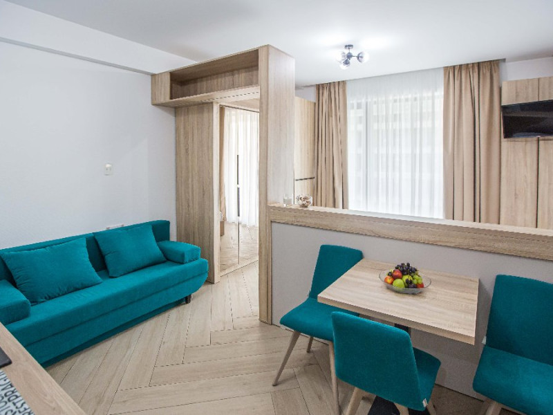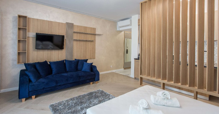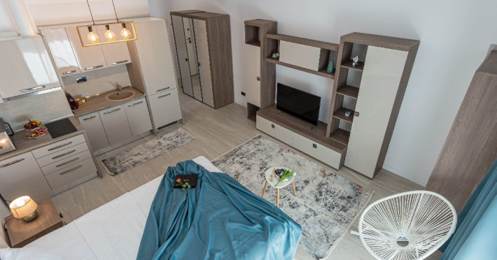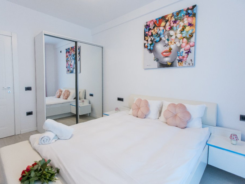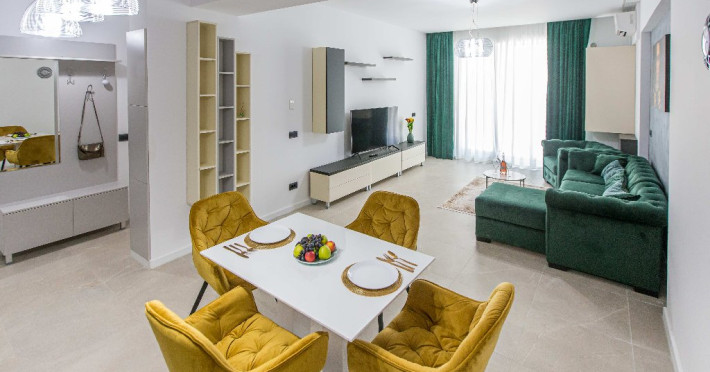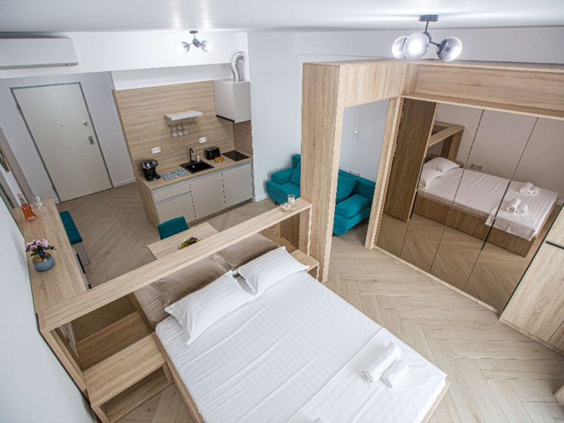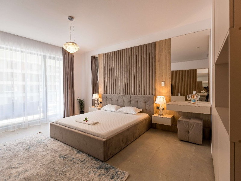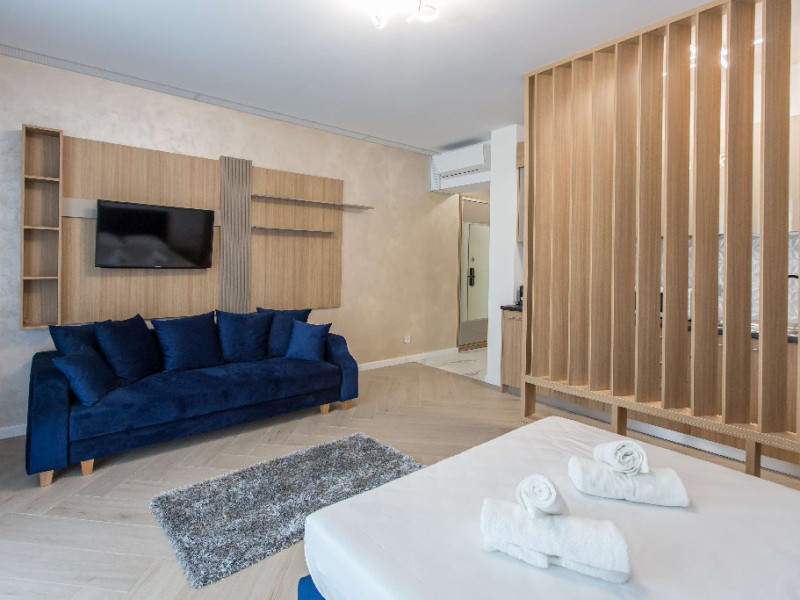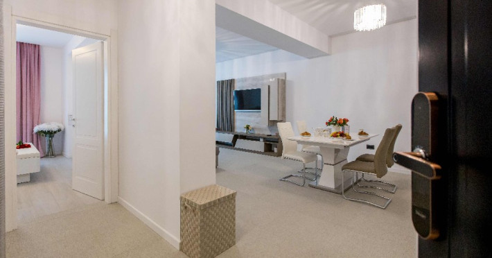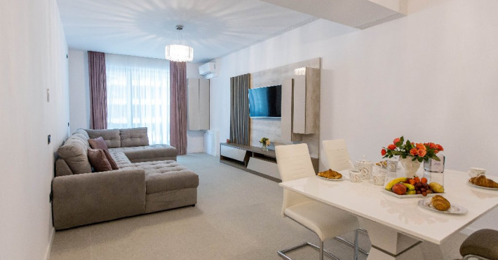 Dotari camere: canale TV Internationale, TV Led- Cablu, Wi-Fi, sistem Smart Home, sistem climatizare, incalzire prin pardoseala, expressor, cuptor cu microunde, masina de spalat vase, frigider, pat matrimonial, sofa extensibila/neextensibila/dupa caz, uscator de par, dus, cada, halat baie, prosoape, papuci, cosmetice, balcon/terasa, cu mobilier (masa, scaune), bucatarie/chicineta utilata. Optional: Pat suplimentar Optional: baby cot