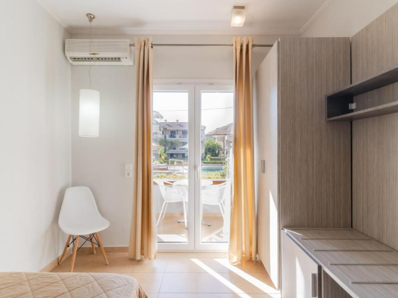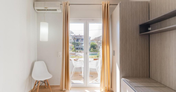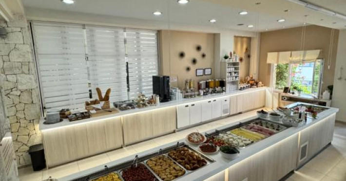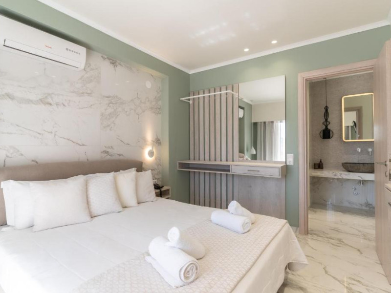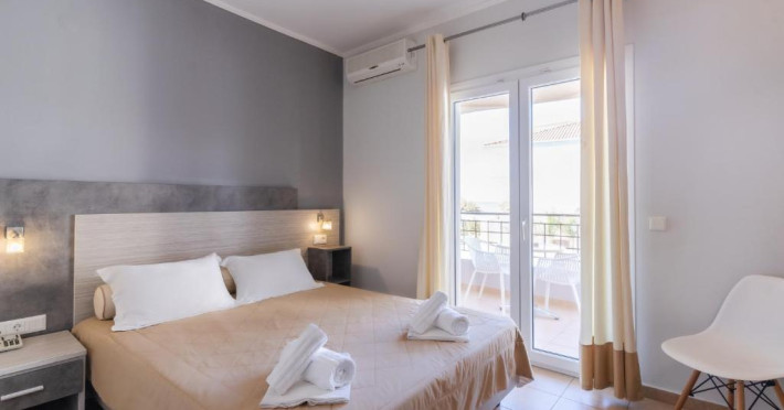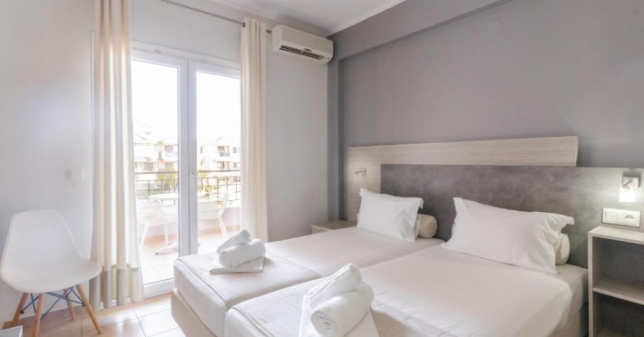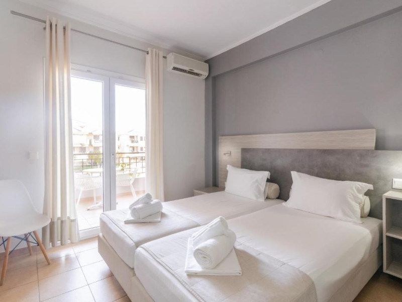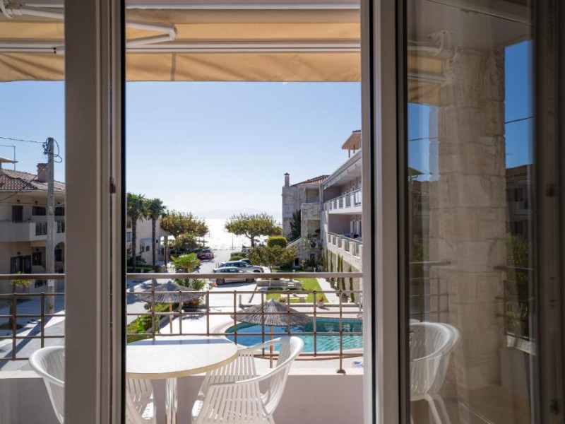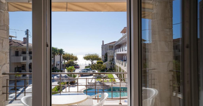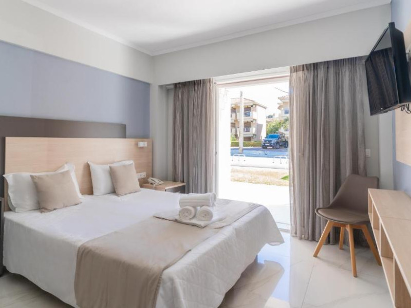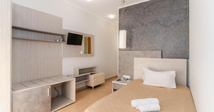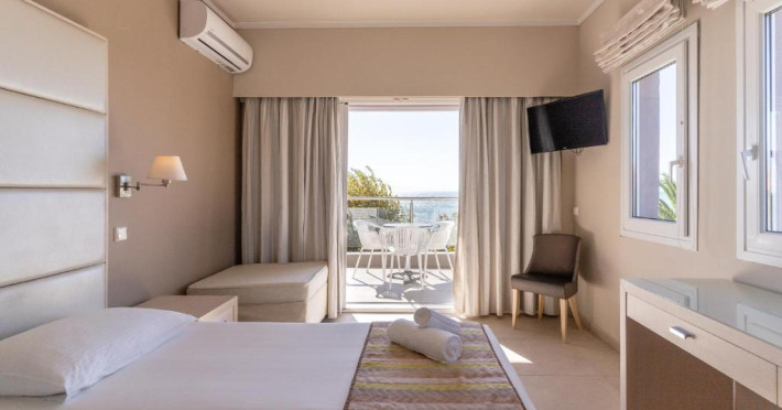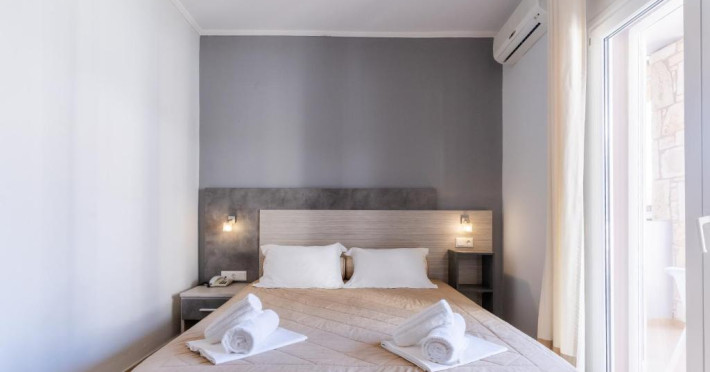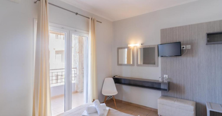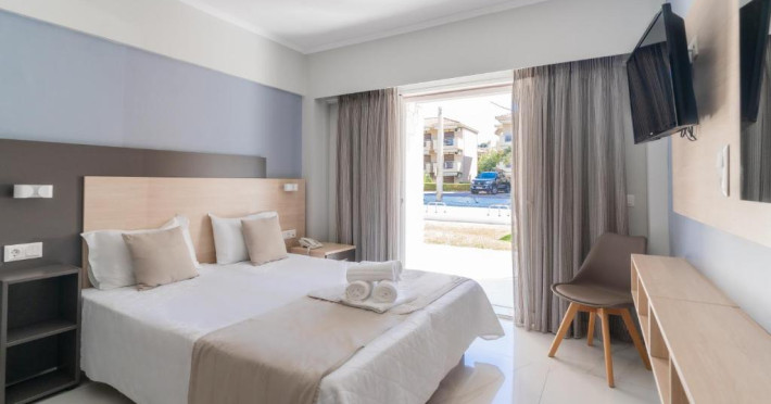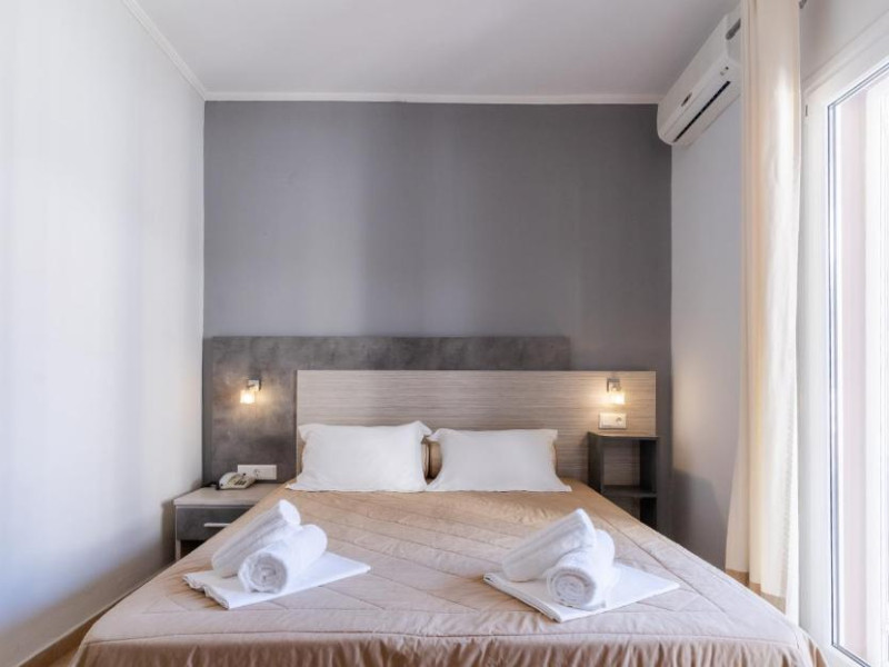 Camerele luminoase și confortabile sunt dotate cu aer condiționat, TV, mini-frigider și balcon, majoritatea oferind priveliști spre Marea Egee. Oaspeții se pot bucura de piscina in aer liber inconjurată de șezlonguri și umbrele, perfectă pentru relaxare.