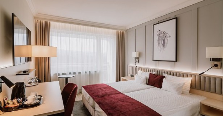 Camera dubla DeLuxe Plus are 21 mp si dispune de pat matrimonial king size sau twin, balcon, noptiera cu lampa de noapte, birou, scaune cu masuta cafea, oglinda de perete, oglinda de dimensiune completa, TV led (cablu cu canale radio), telefon, minibar, seif, aer conditionat controlat individual, incalzire centralizata, Wi-Fi. Baie in camera cu cabina de dus, toaleta, chiuveta, oglinda pentru machiaj, uscator de par, prosoape de spa, halat de baie si articole de toaleta gratuite. Vedere spre lac.