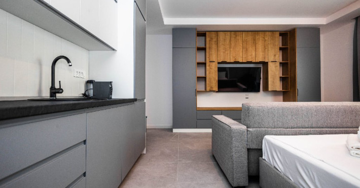 Cu o suprafata generoasa de 40 mp, studioul este gandit sa ofere un spatiu primitor si aerisit, perfect pentru cupluri, familii cu copii sau grupuri mici de prieteni. Designul sau imbina armonios simplitatea moderna cu dotarile utile, pentru ca fiecare sedere sa fie una relaxanta si lipsita de griji.