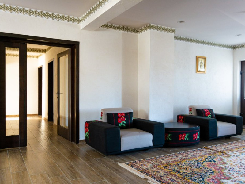 DESCRIERE UNITATE DE CAZARE Vatra Boiereasca este un complex compus din Conacul Boieresc si patru casute traditionale. Pe vremuri, in centrul marilor sate, se afla conacul, resedinta boierilor, mari proprietari de pamant. Asa este si la Vatra Boiereasca, conacul sade impunator si vegheaza restul Vetrei, dar si imprejurimile mioritice ale zonei impadurite. Daca vrei sa simti cum s-a trait odinioara si sa te bucuri de confortul boieresc, trebuie sa te hodinesti macar cateva zile in una dintre cele 6 odai sau 2 apartamente, dispuse pe doua etaje, pe langa care vei mai descoperi o sala de evenimente generoasa, dar si o bucatarie echipata cu toate cele de trebuinta unui bucatar iscusit. De la ferestrele odailor vei fi rasplatit cu o priveliste de vis asupra padurii ce inconjoara falnic Vatra Boiereasca, iar de pe veranda vei putea sedea intr-un leagan si privi iazul si casutele traditionale. Dintre facilitatile odailor conacului amintim:pat dublu (apartamentele au si cate o canapea extensibila), baie proprie cu dus si articole de toaleta, aer conditionat,TV, minibar, halat de baie, prosoape, papuci, balcon (pentru odaile duble de la primul etaj). Capacitatea de cazare a conacului este de 20 adulti.