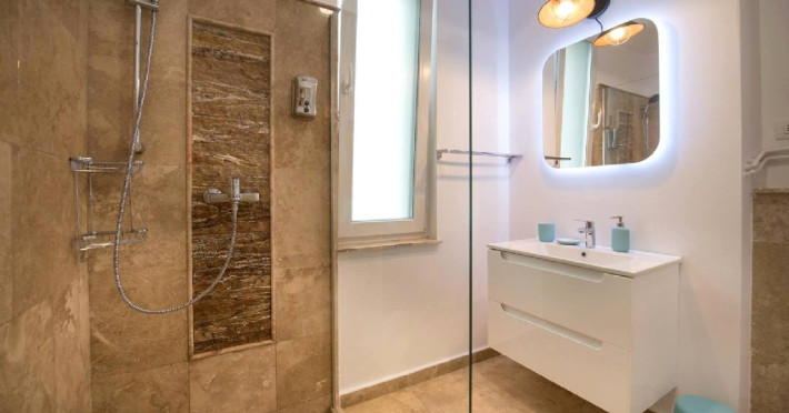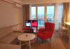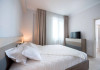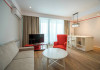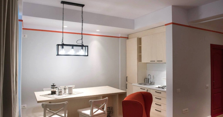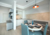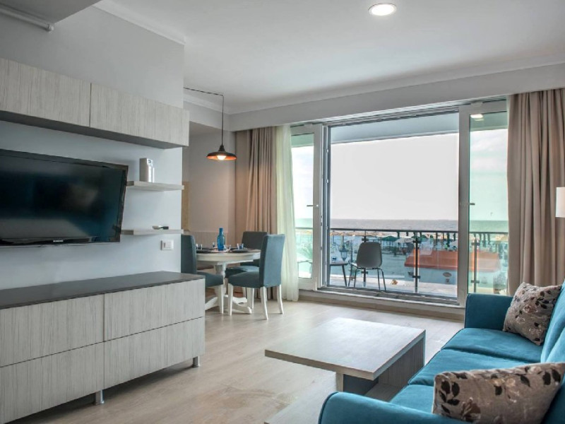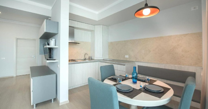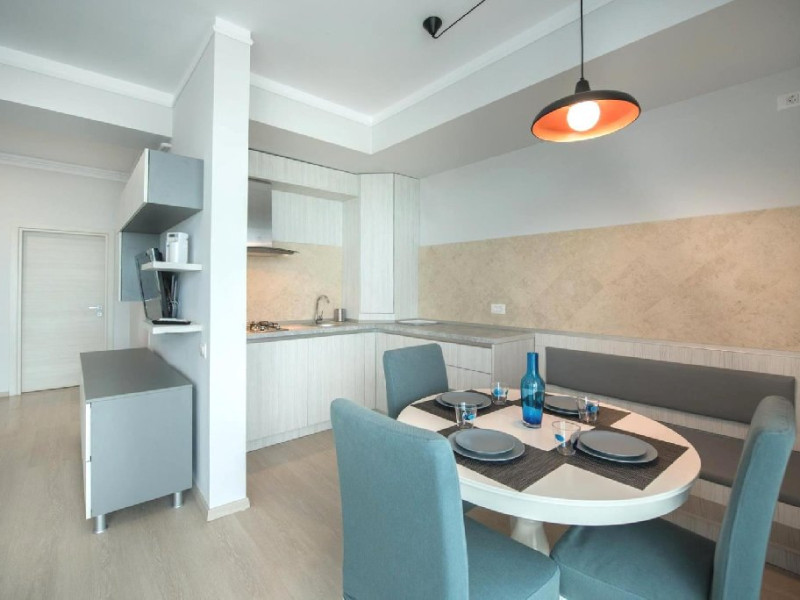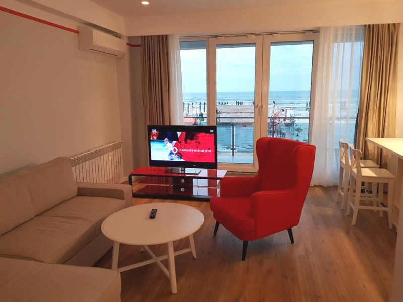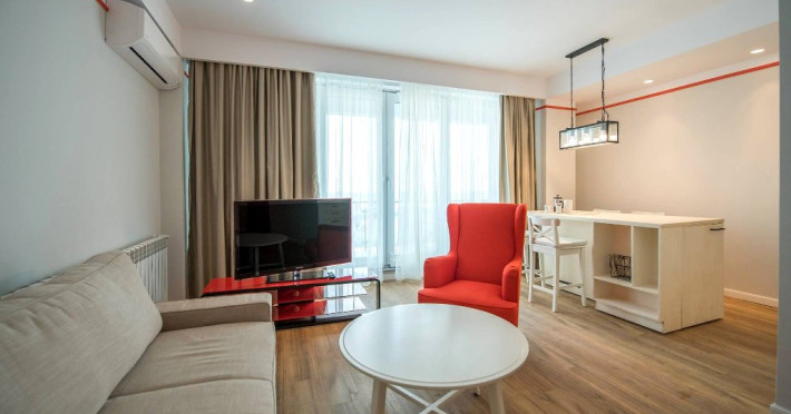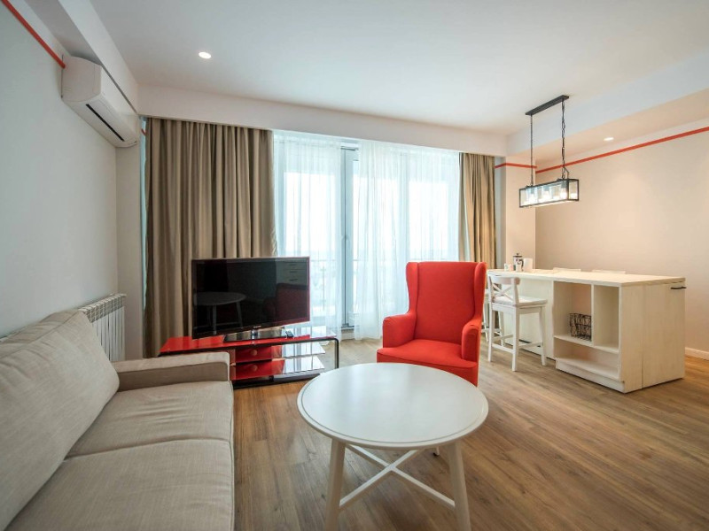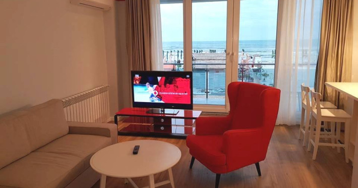 Dotari camere Apartamentul este compus din dormitor cu pat matrimonial si living cu canapea extensibila, bucatarie de tip open space, complet mobilata si utilata (frigider, plita pe gaz, cuptor cu microunde, esprssor de cafea cu cafea boabe, vesela, tacamuri), aer conditionat, TV, Internet, suport uscator de rufe, masa de calcat si fier de calcat, uscator de par, mobilier pe balcoane/ terase. Capacitate maxima: 4 persoane. Orele de check-in si check-out: check-in: 15.00, check-out: 11.00.
