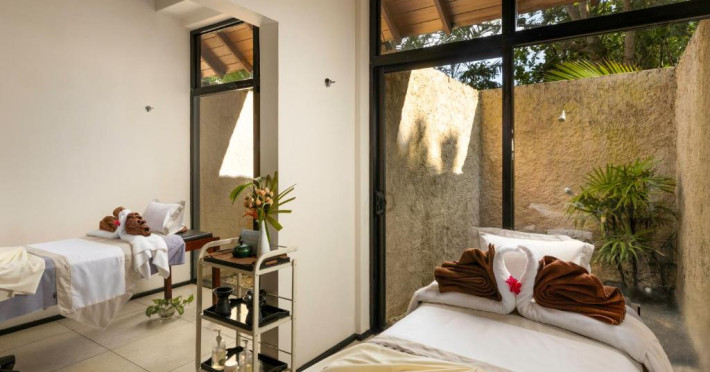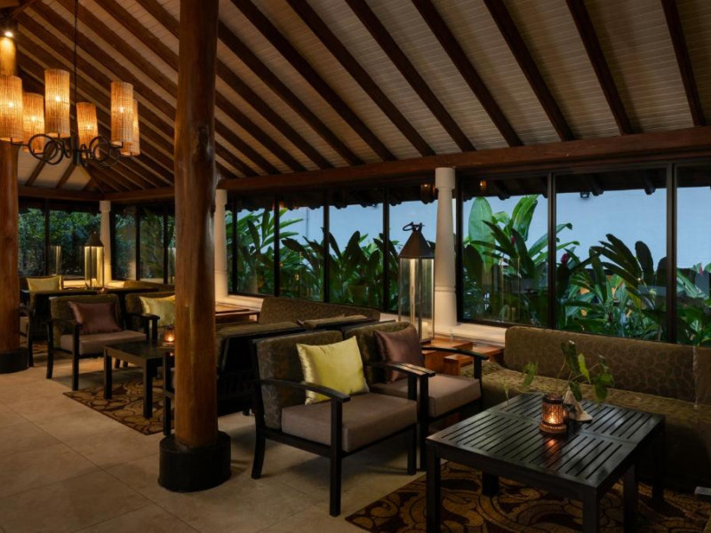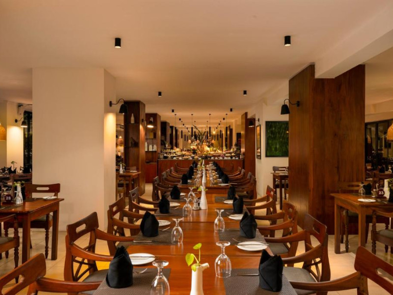 Restaurantul principal servește preparate din bucătăria internațională și specialități locale din fructe de mare proaspete. Piscina infinity oferă priveliști incredibile spre ocean, iar centrul spa propune tratamente ayurvedice autentice.